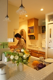 こちらには、奥様がどうしてもいれたかったアンティークパインの棚がすっぽり収まるようミリ単位でカウンターを造作。