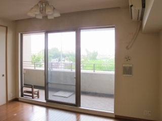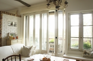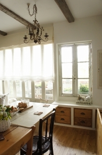 大きなアルミの掃出しがあるのですが、マンションなので手を加えることができません。なので、掃出し窓の内側に造作ガラス折れ戸とアンティークの開き戸を取り付けて、オープンカフェのような雰囲気に作り替えました。