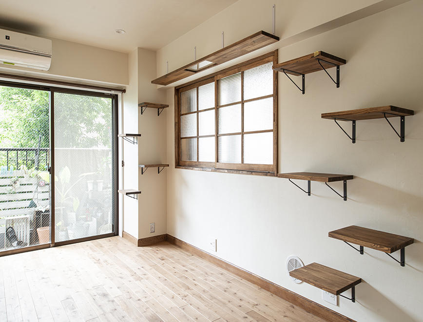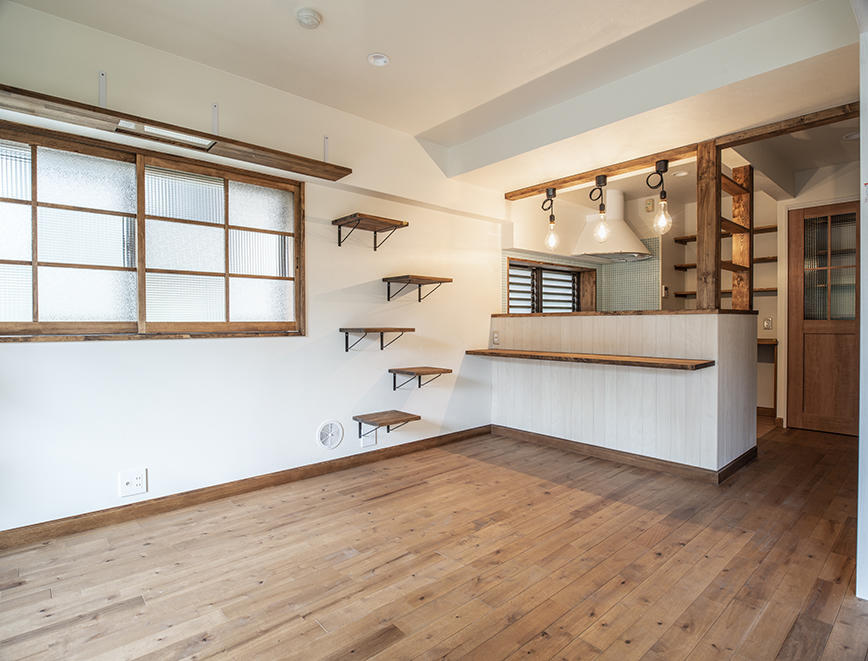 クロス・フローリングの張替えでお部屋をリフレッシュ。私らしい部屋にするために造作棚・窓を施工。キッチンも新設してタイルを貼りました。リノベーションでテイストを揃えると、より満足度の高い室内に変わります。