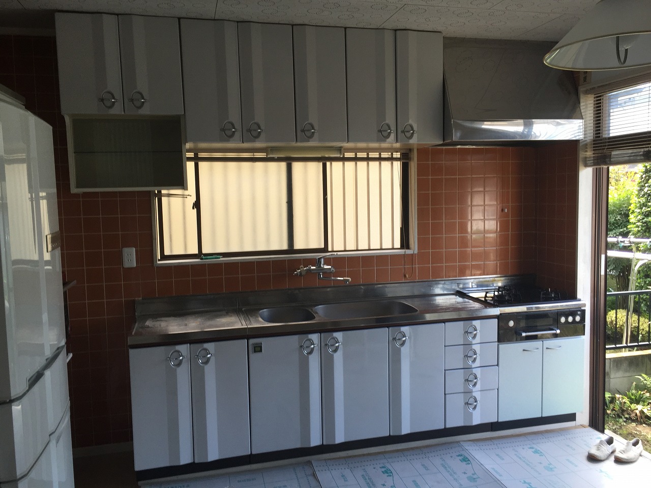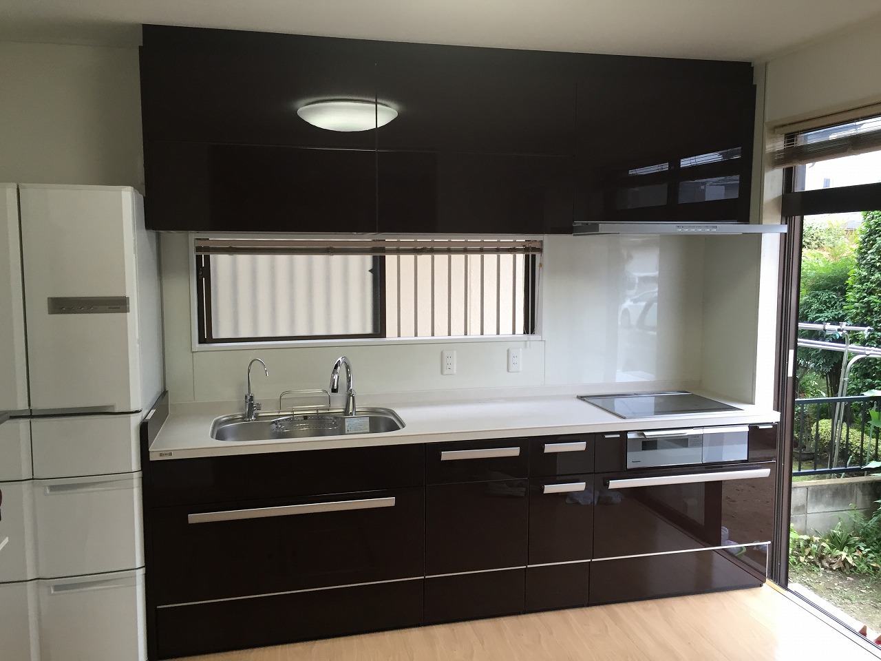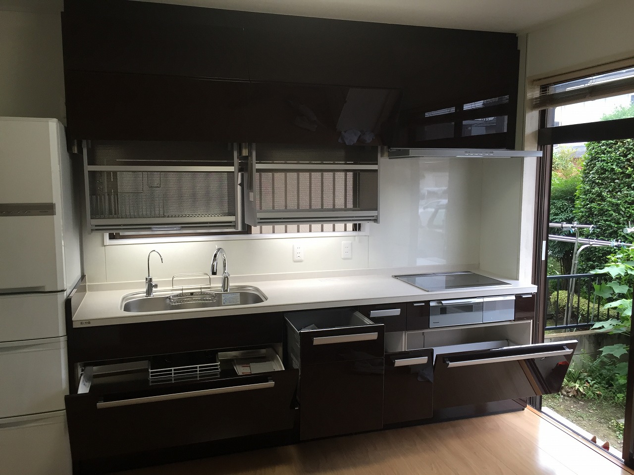 LIXILシステムキッチン リシェルSI I型2700を設置しました。オートダウンウォールの水切棚タイプもシンク上に設置。洗った食器類をそのまま収納できちゃいます。まな板、ふきん掛けも付いていて便利。