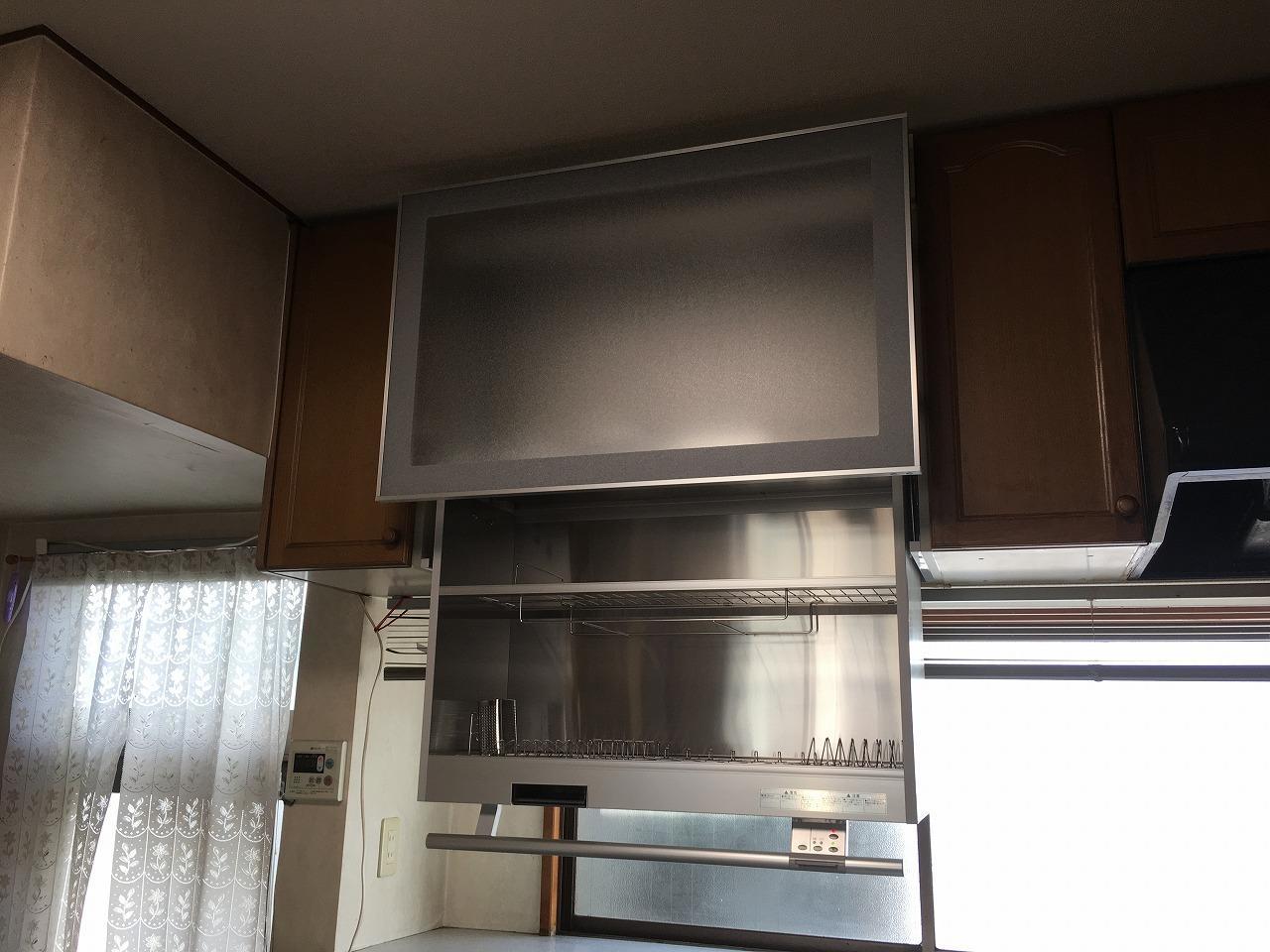 もともとあった吊戸棚と食器乾燥機をとって、新しく電動昇降食器乾燥機をピッタリ設置。窓からの光もたくさん入るようになり、明るく快適なキッチンになりました。庫内は食器乾燥機になっていて、たくさんの食器が収納・乾燥できるようになっています。電動で下降してくるので、負担無く食器が出し入れできます。