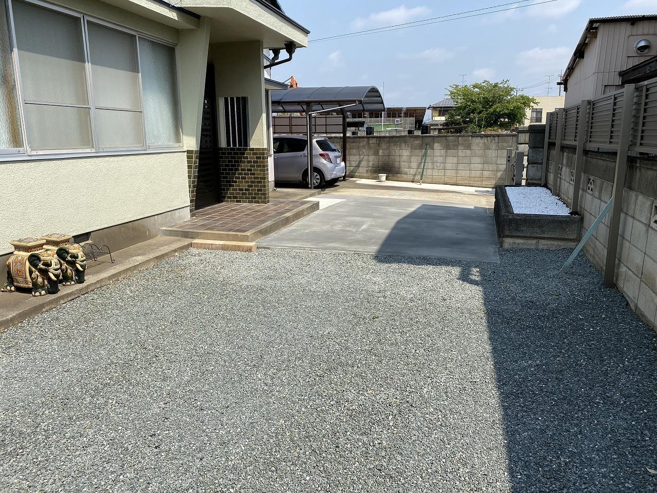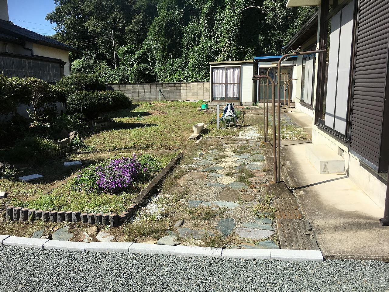 草木の手入れ、雑草の処理から解放されすっきりとしたお庭に変身。 防草シートを敷いて、砕石を敷きつめました。 少しだけ花壇を残したことで、季節の移り変わりを楽しむことができます。