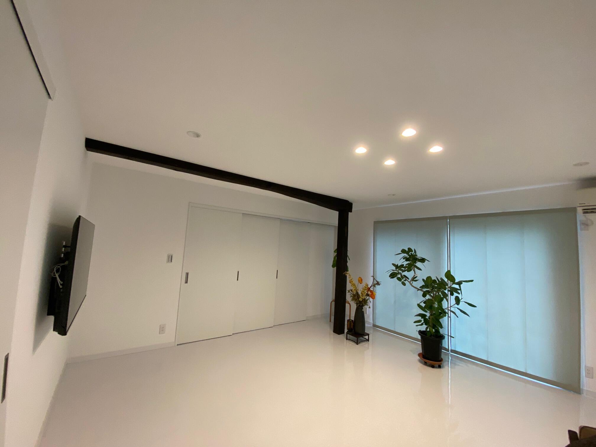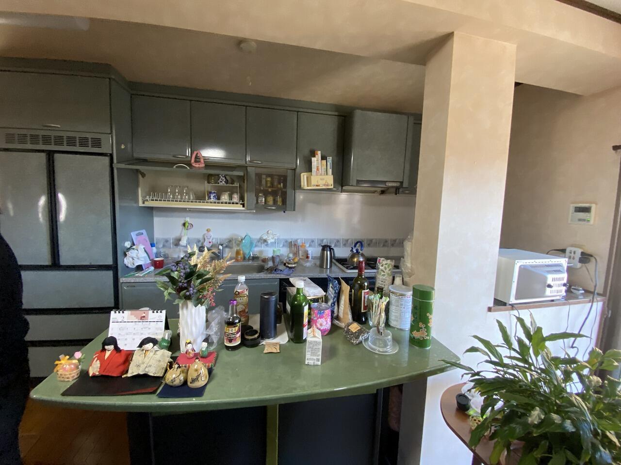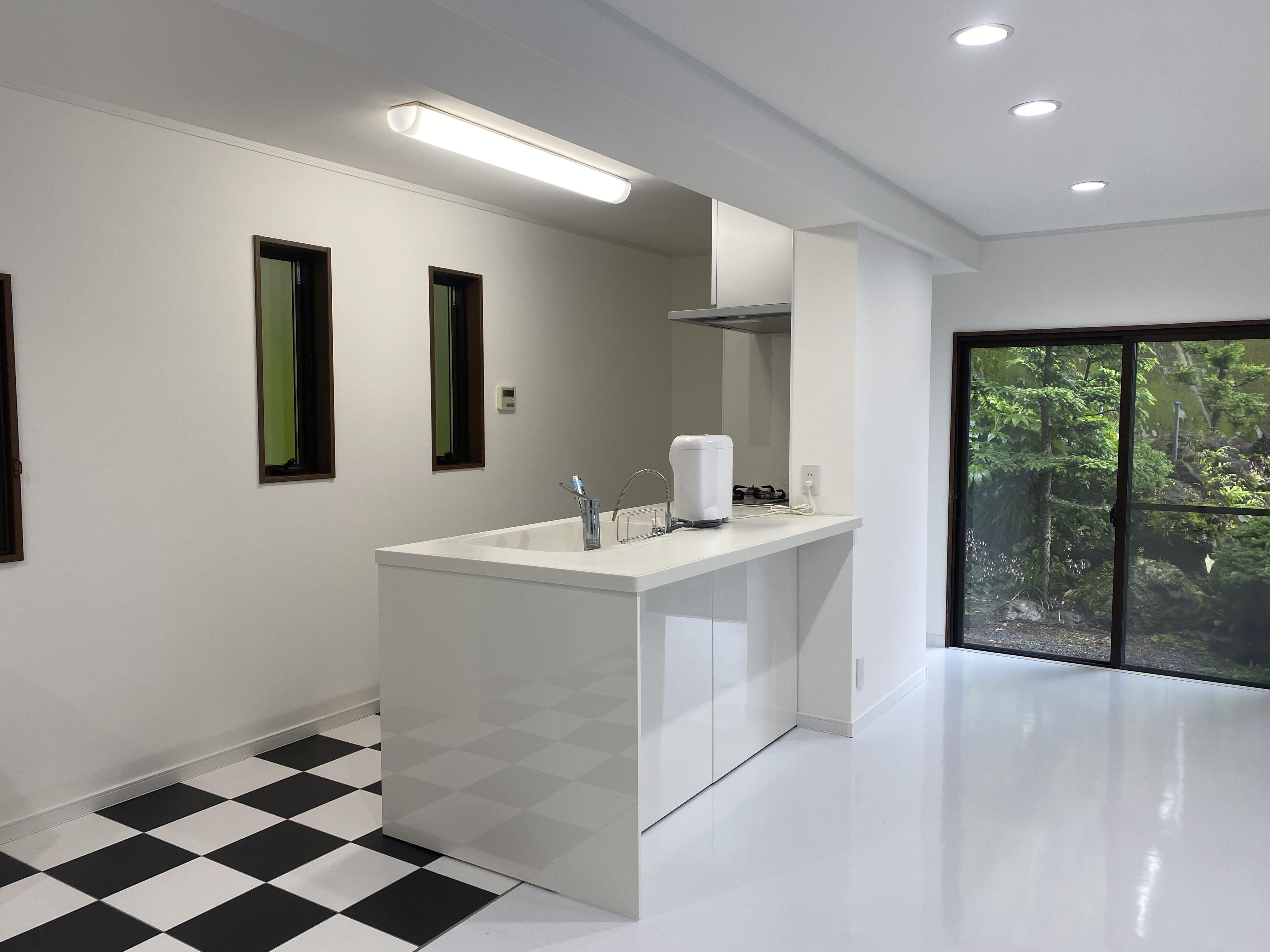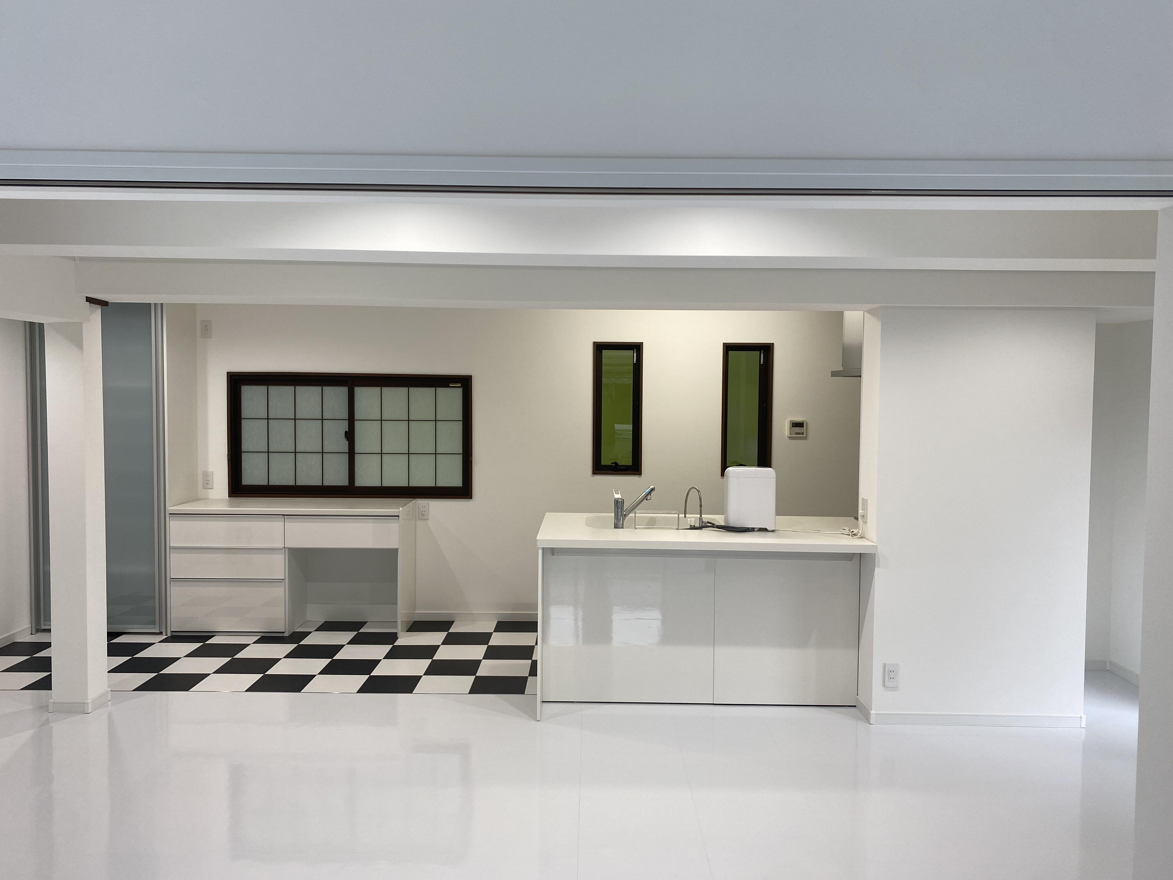 日当たりの良い応接室を活用したい!というご要望でした。 壁を撤去したことで、明るく、太陽の光や温かさを感じられるキッチンになりました。 キッチンの床は、お客様のご要望により市松模様で白黒のタイル貼となっています。