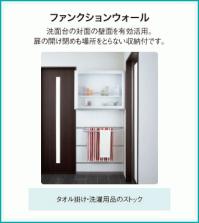 洗面化粧台の横や上、洗濯機の上の空間を活用することで、家事効率を上げる収納量を確保。