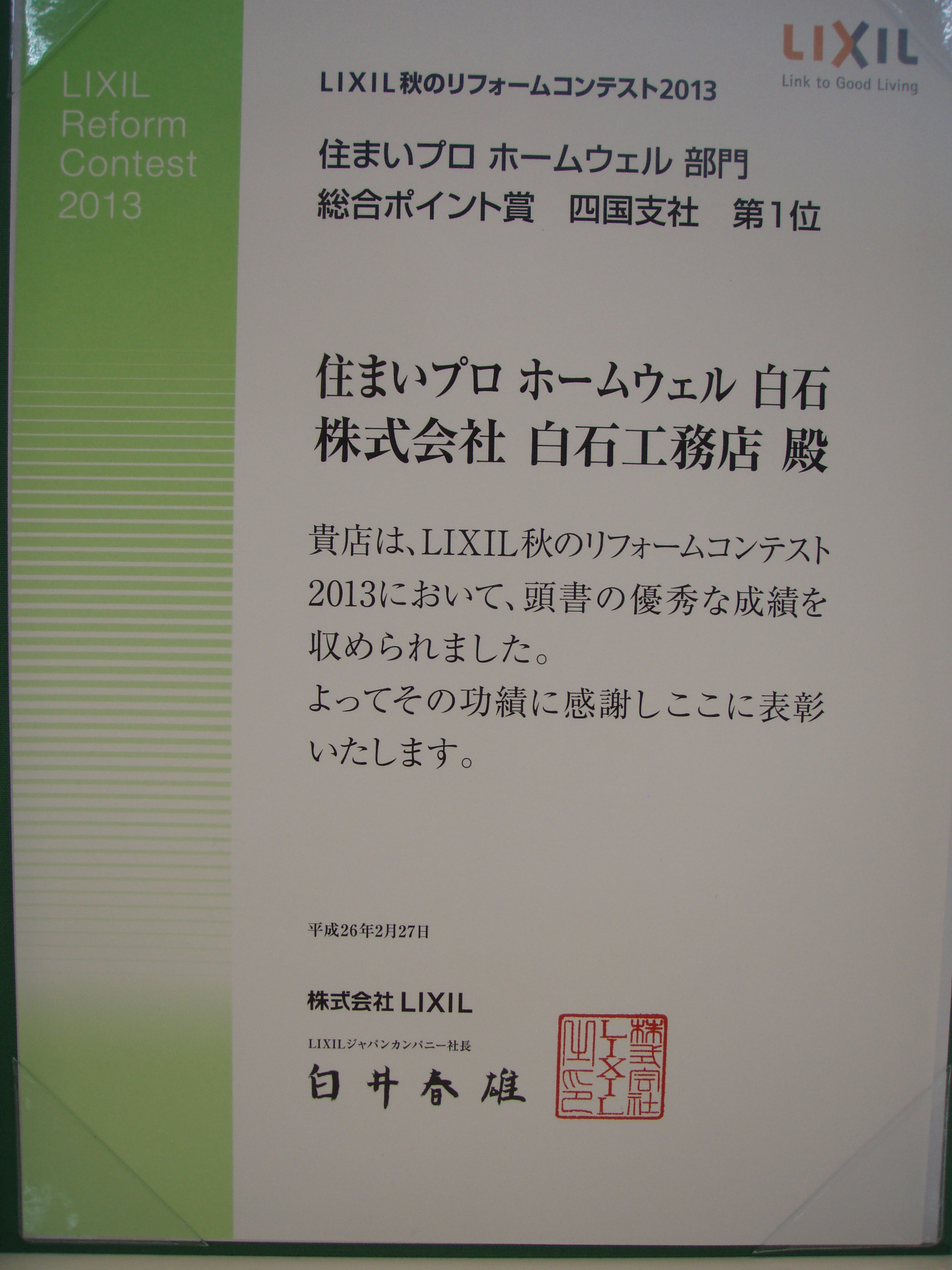 住まいプロホームウェル部門 総合ポイント賞 四国支社 第1位」