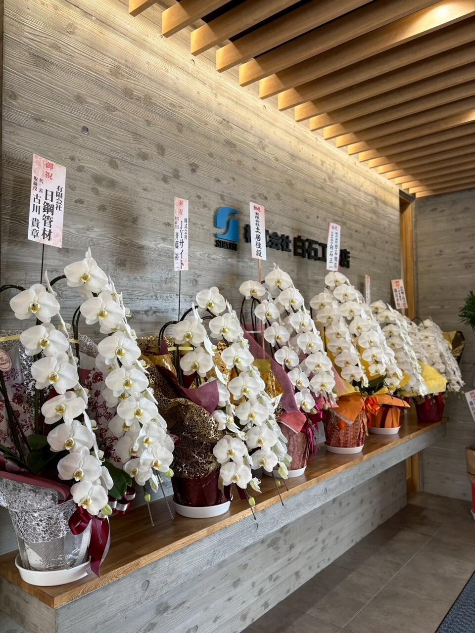 新しい社屋が華やかに彩られ皆様からの温かいお心遣いに感謝しております。