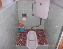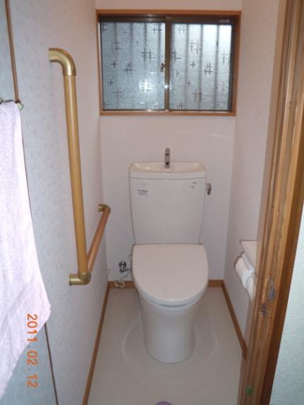 段差が非常にあり危ない和式トイレでした。腰壁タイルを撤去し、クロスに貼り替え、床もクッションフロアに替えました。和式トイレから暖房便座の洋風トイレになり、手摺も取り付けて安全なトイレになりました。
