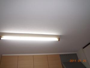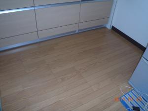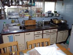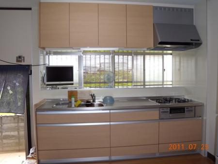 収納スペースがたくさんある、明るい色のシステムキッチンです。