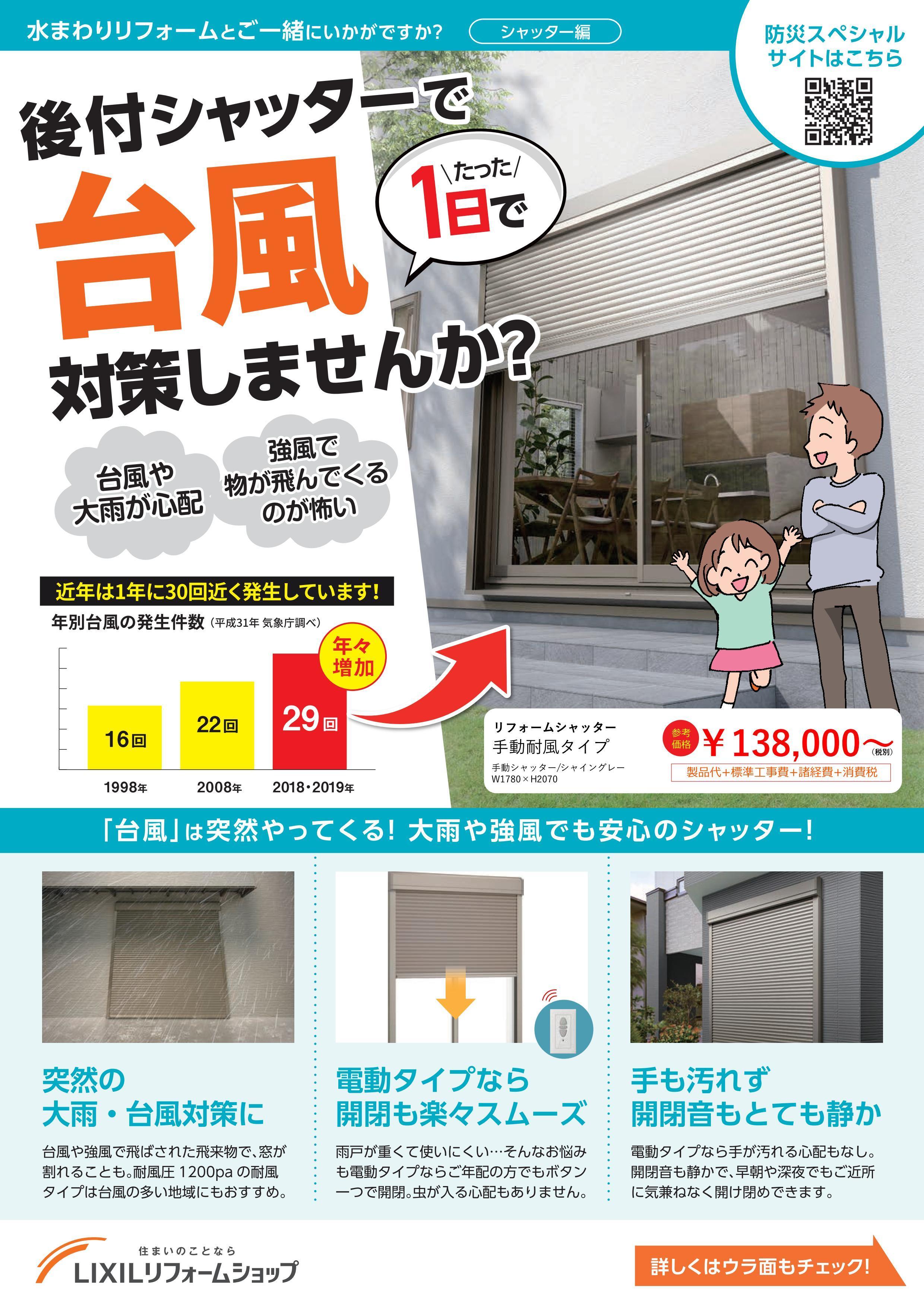 こんにちは!リフォーム部 吉田です(^^♪年々増加傾向にある「台風災害」!去年(2019年)の台風では約200件のお問い合わせがありました。食料確保・備蓄と合わせて事前にできる「お家の備え」!それは雨戸やシャッターの取付です!(^^)!【後付けシャッター・雨戸取付】※クリックで大きくなります