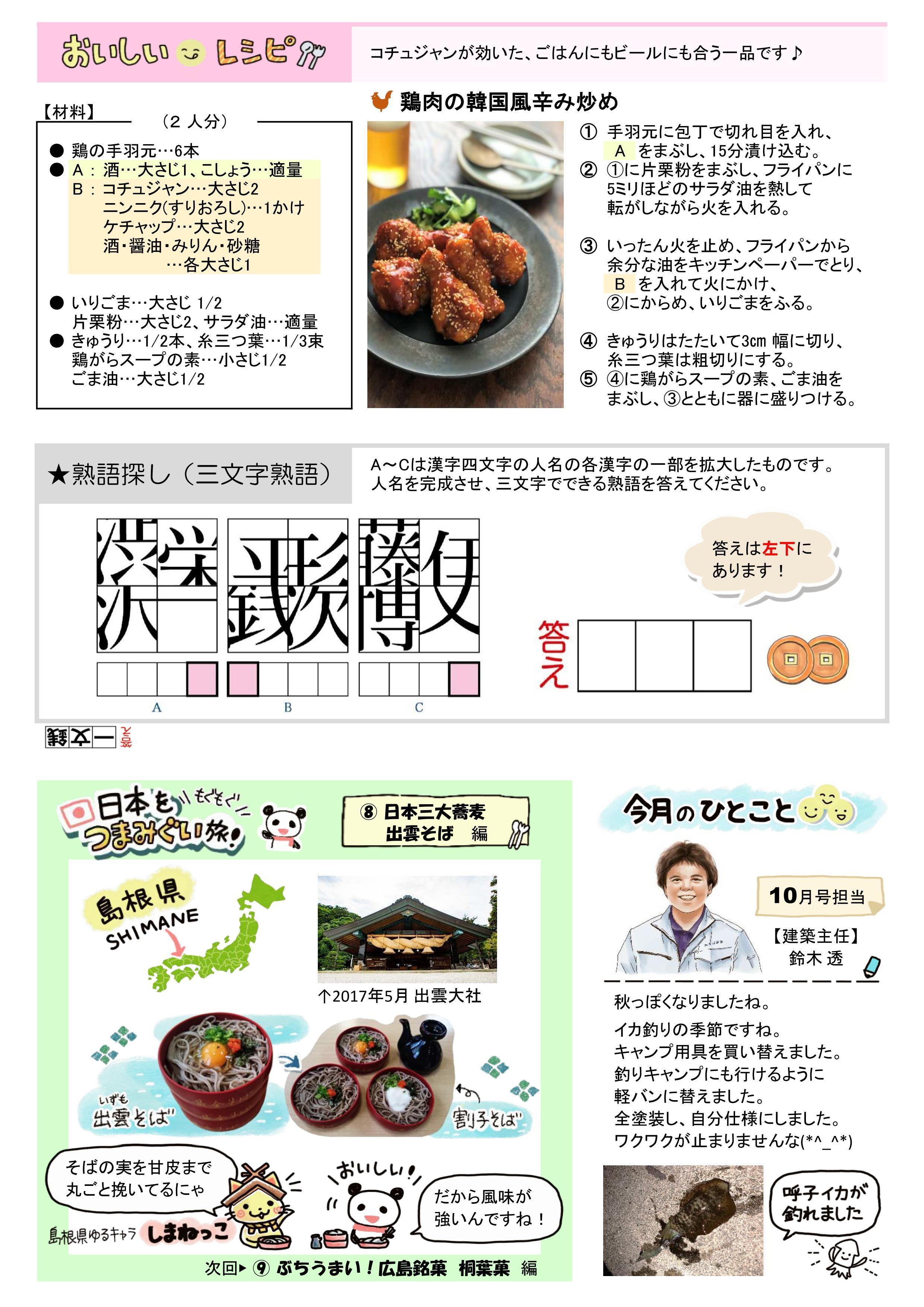 ▼【おいしいレシピ】 鶏肉の韓国風辛み炒め▼【熟語探し】 ▼【日本をつまみぐい旅!】 ⑧日本三大蕎麦 出雲そば 編 ▼今月のひとこと 過去の「かかりつけ」はこちら