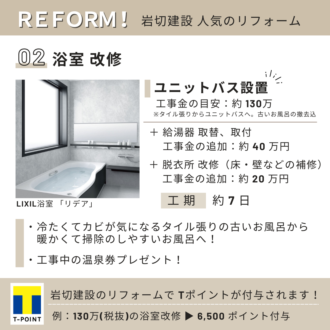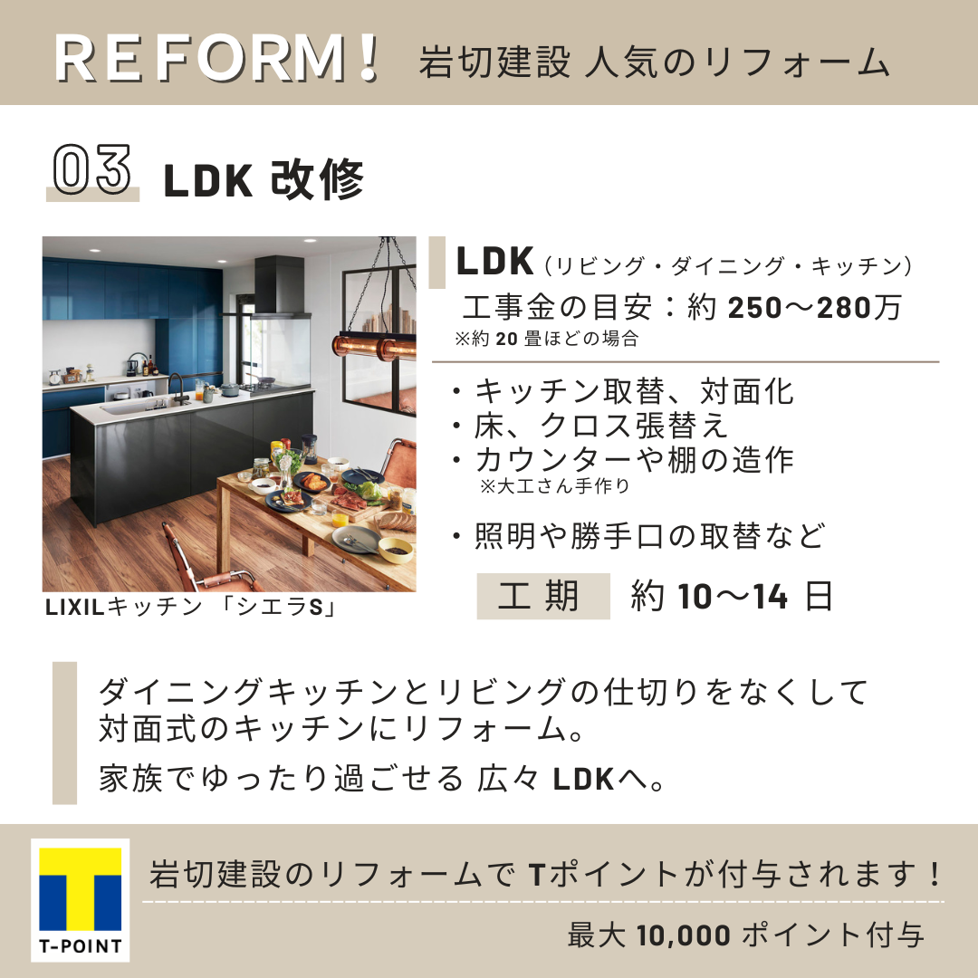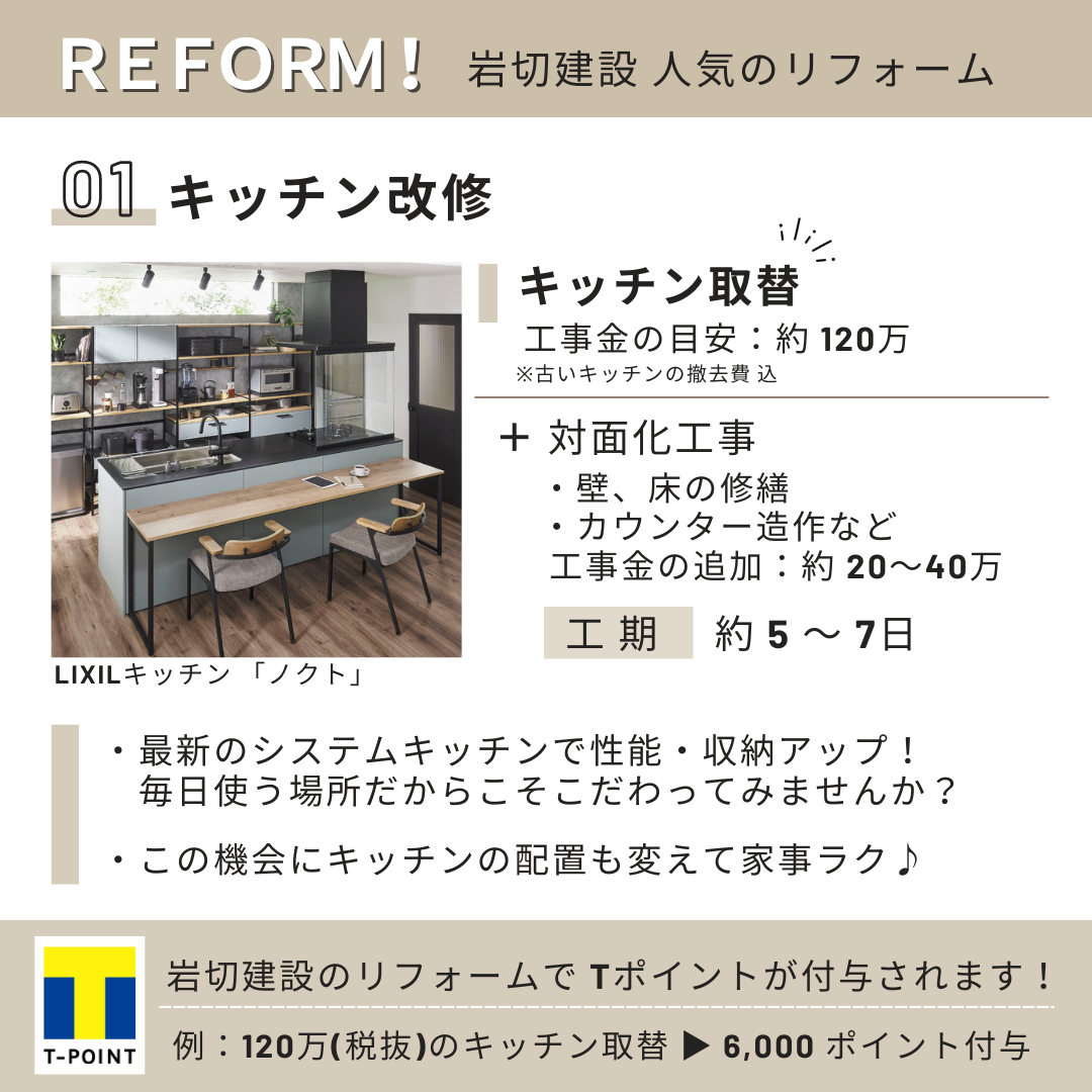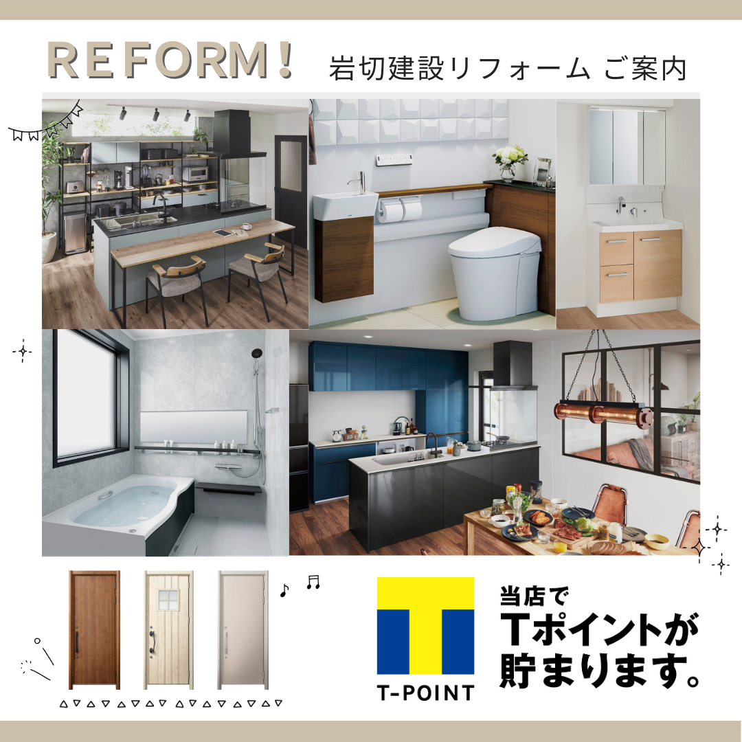 2023.6.6 記事作成岩切建設 リフォーム部です。Tカードをお持ちの方へお得な情報です♪弊社でリフォームをされた方で、ご希望の方にはTポイントを付与しております!岩切建設で人気のリフォーム!▬ 01 キッチン改修▬ 02 浴室 改修▬ 03 LDK 改修今回は人気のあるリフォームを3選 ご紹介しましたが、他の工事も承っております。岩切建設リフォーム部までお気軽にご相談ください!お電話(0120-93-0552)もしくは HP よりどうぞ!弊社施工事例は こちら