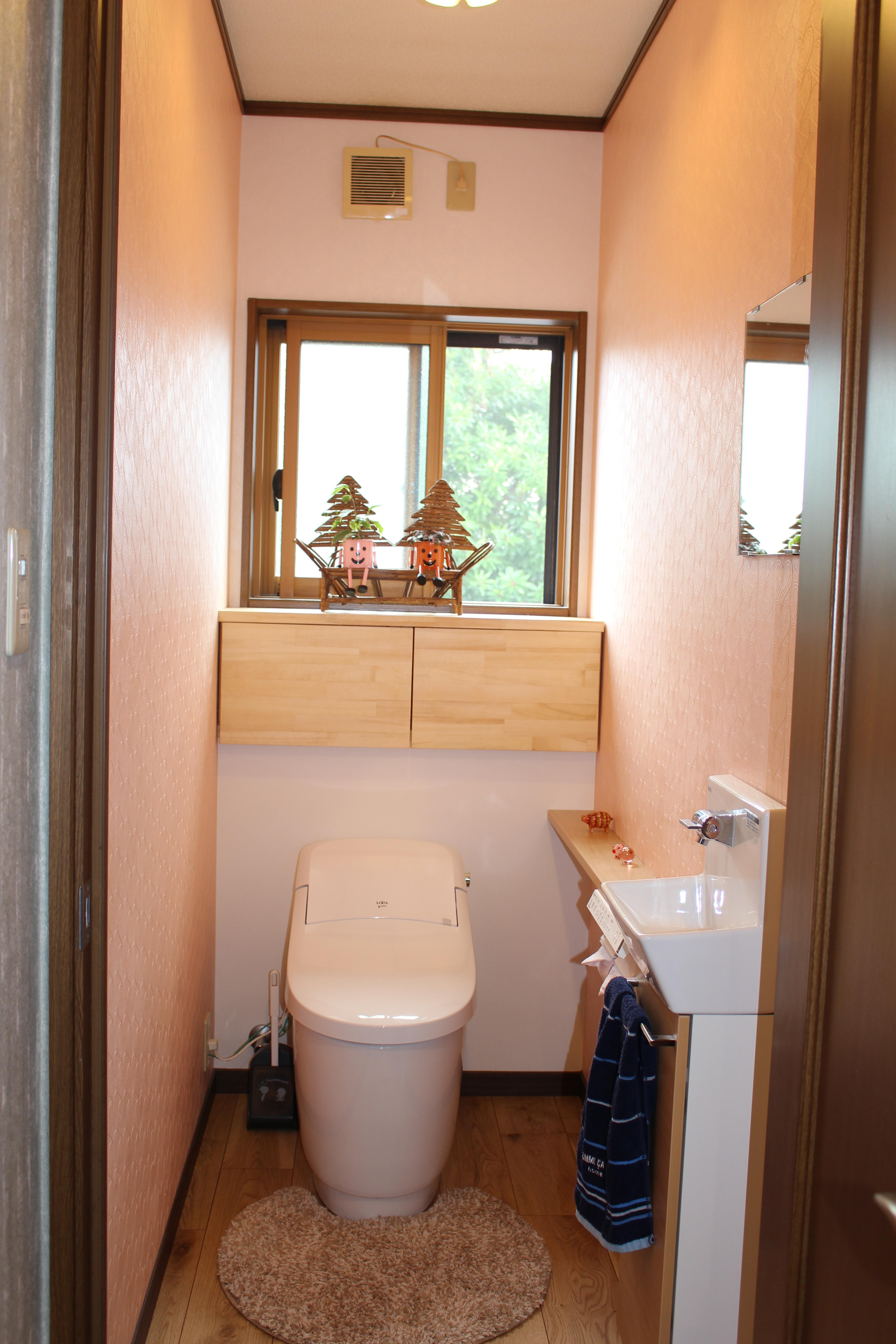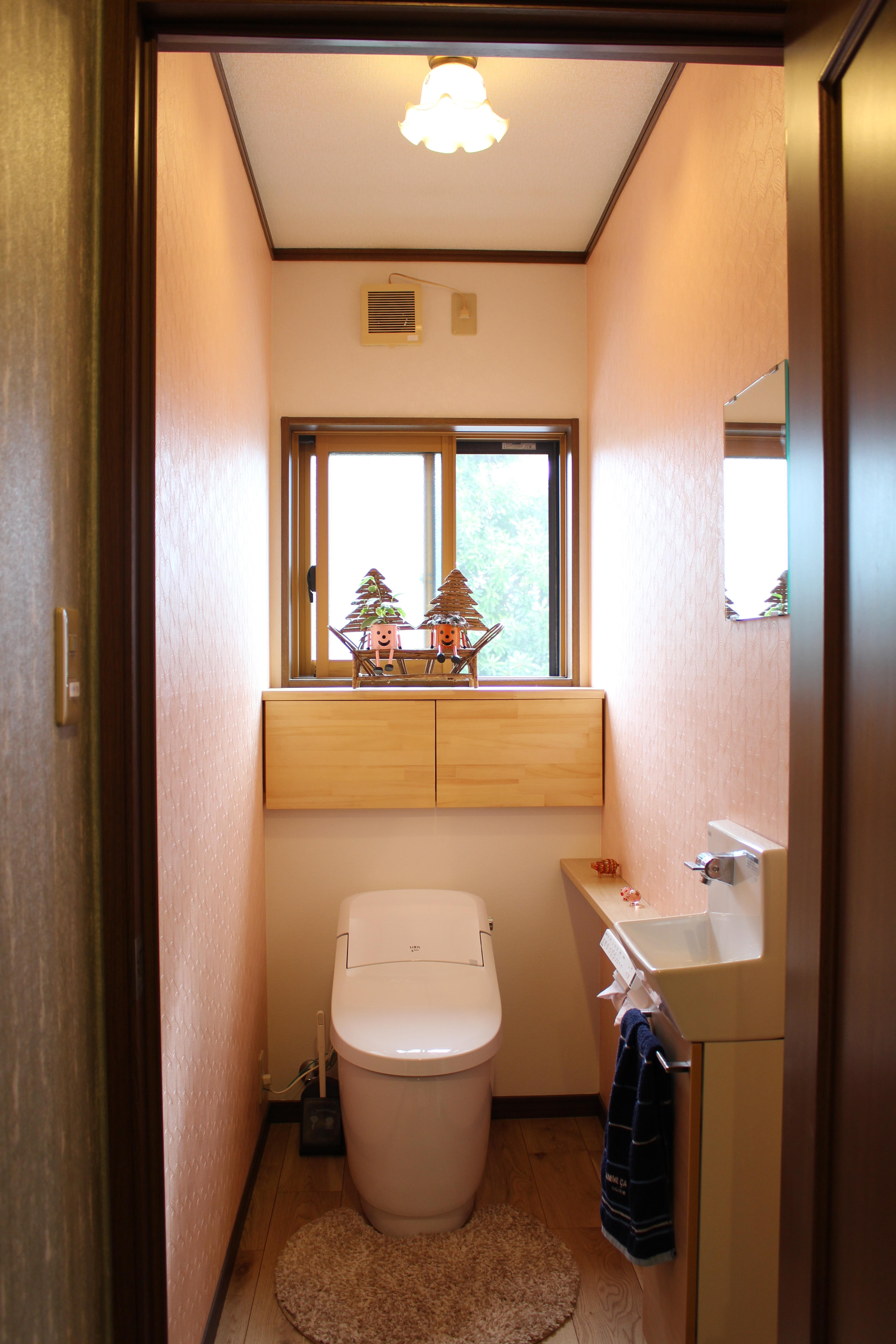 今回増築と合わせ、トイレをタンクレストイレへ変更、手洗いと収納も設けました。トイレはLIXIL製品プレアスです。手洗器はLIXIL製品コフレルのスリムタイプです。立ち座りの支えにもなる身体に優しいカウンターが付いており、洗面器の下は収納になっています。その他トイレの床を変え、窓際に手作りの収納を設けました。床の物がなくなり、明るくスッキリとしたトイレになりました。