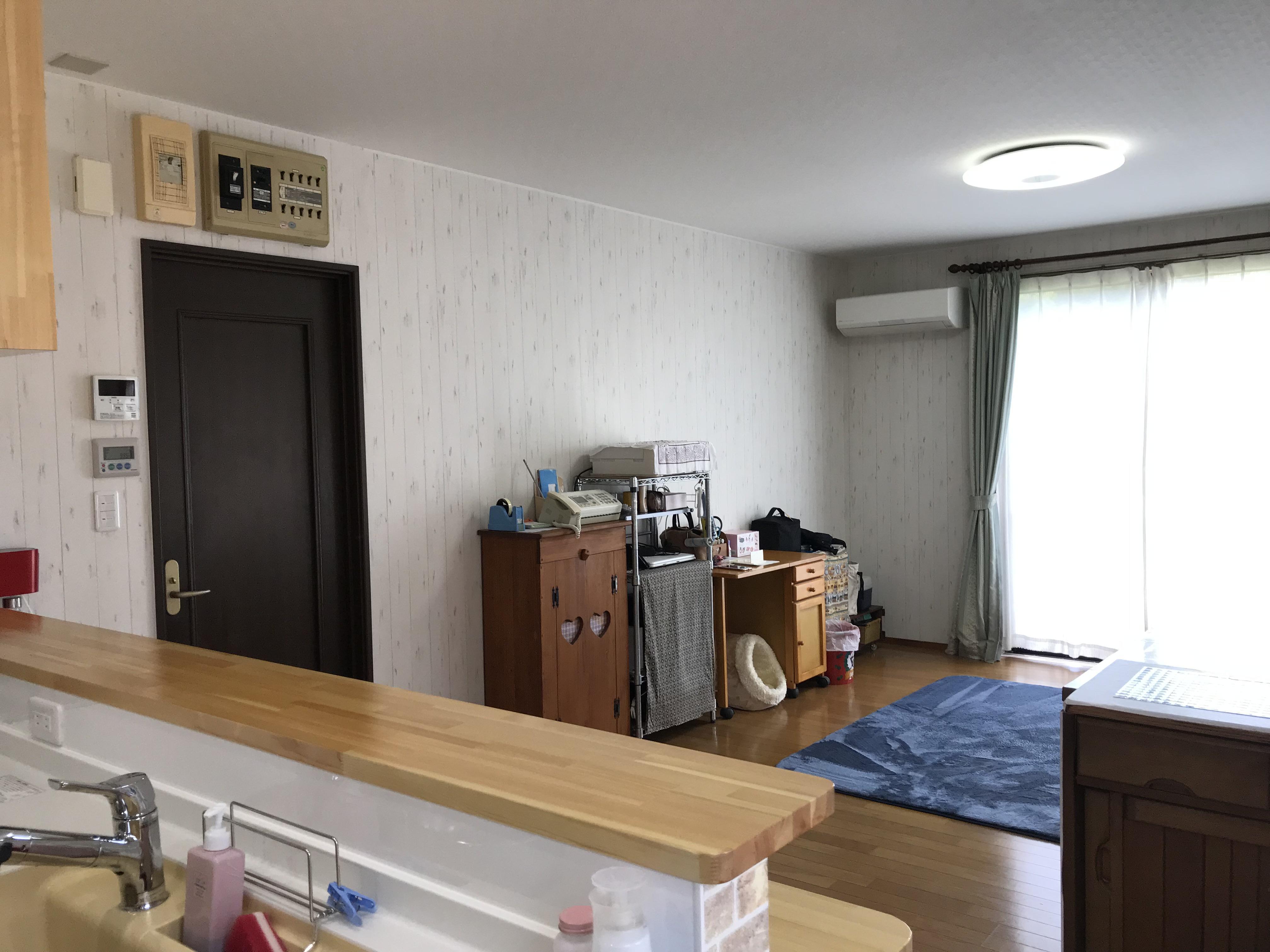 キッチンとリビングの境目にある垂れ壁、お施主様より撤去したいとご依頼がありました。垂れ壁の撤去と、壁・天井のクロス張替を行っています。奥様が選ばれたクロス、白を基調とした木目調の優しい色合いで、部屋全体が明るくなりました。