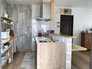 壁付けキッチンを対面にしたい、カウンターや棚を作ってほしいとN様よりご依頼がありました。壁・天井・床等のクロスも新しく張り替えてます。新しいシステムキッチンは、娘さんと一緒にショールームに行って選んだLIXIL製品ASです。