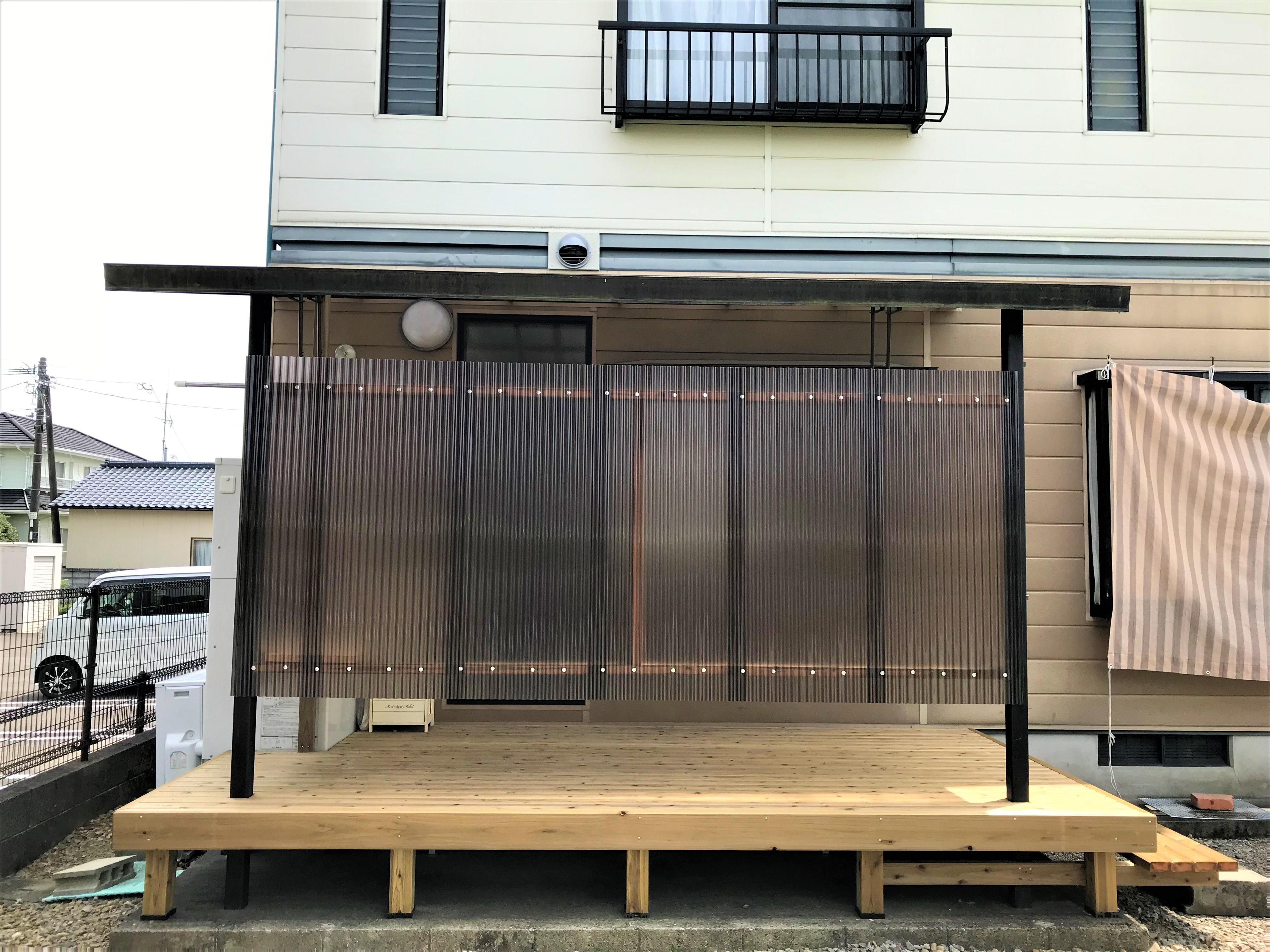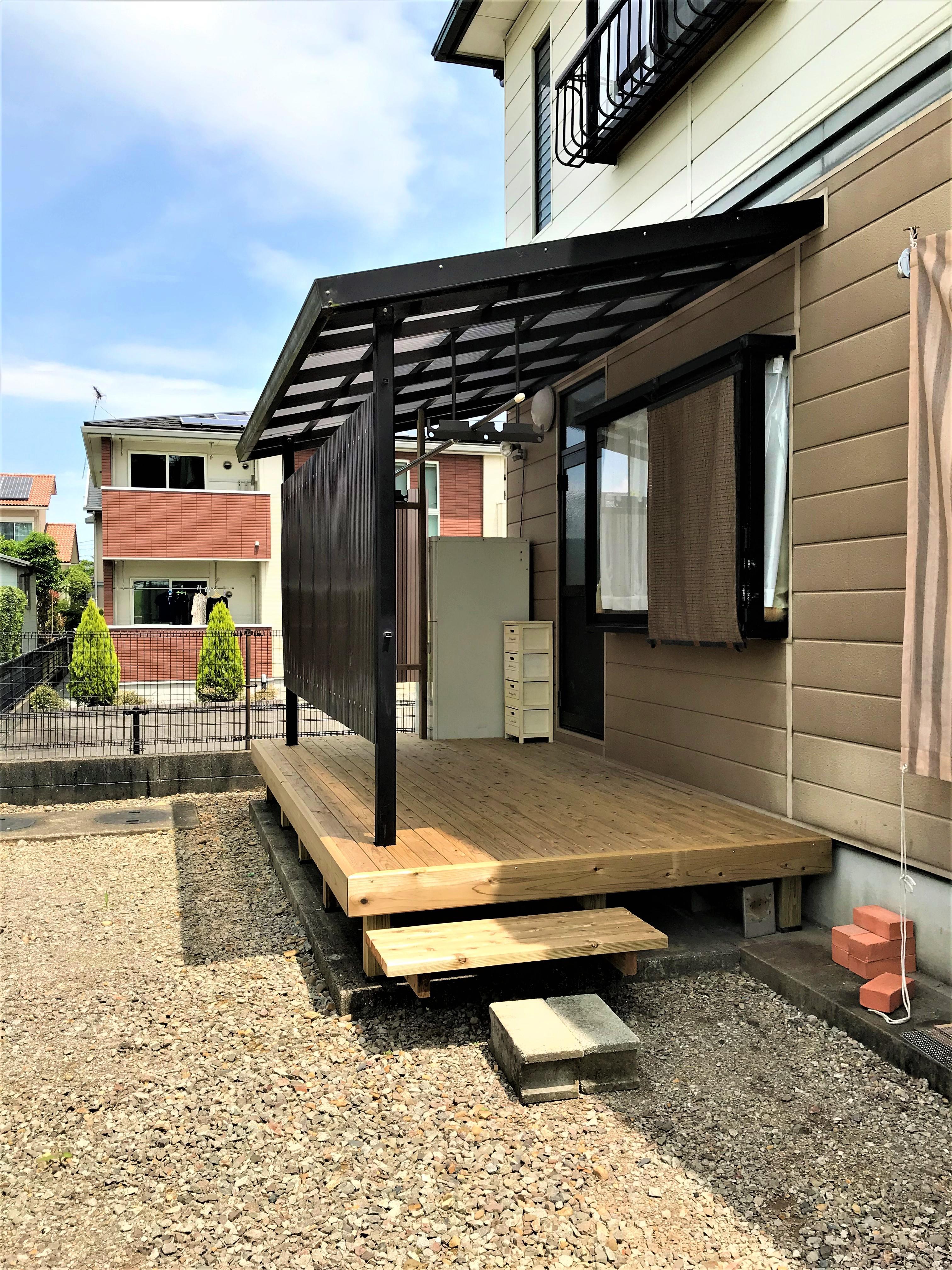 家が道路沿いで洗濯物がまる見えの為、目隠しをしたいとお施主様よりご相談がありました。外部から見えないようサイドパネルを取り付け、プライバシーの確保ができるようになりました。それに合わせデッキも作りました。