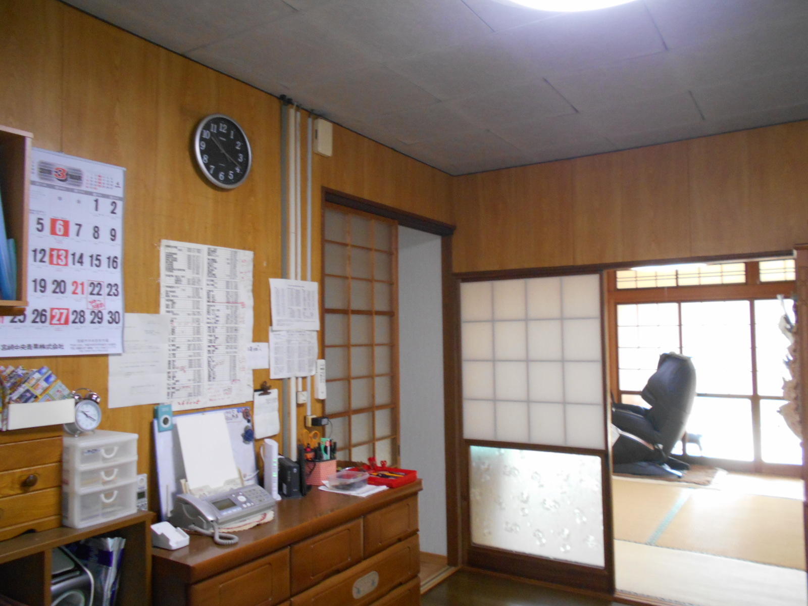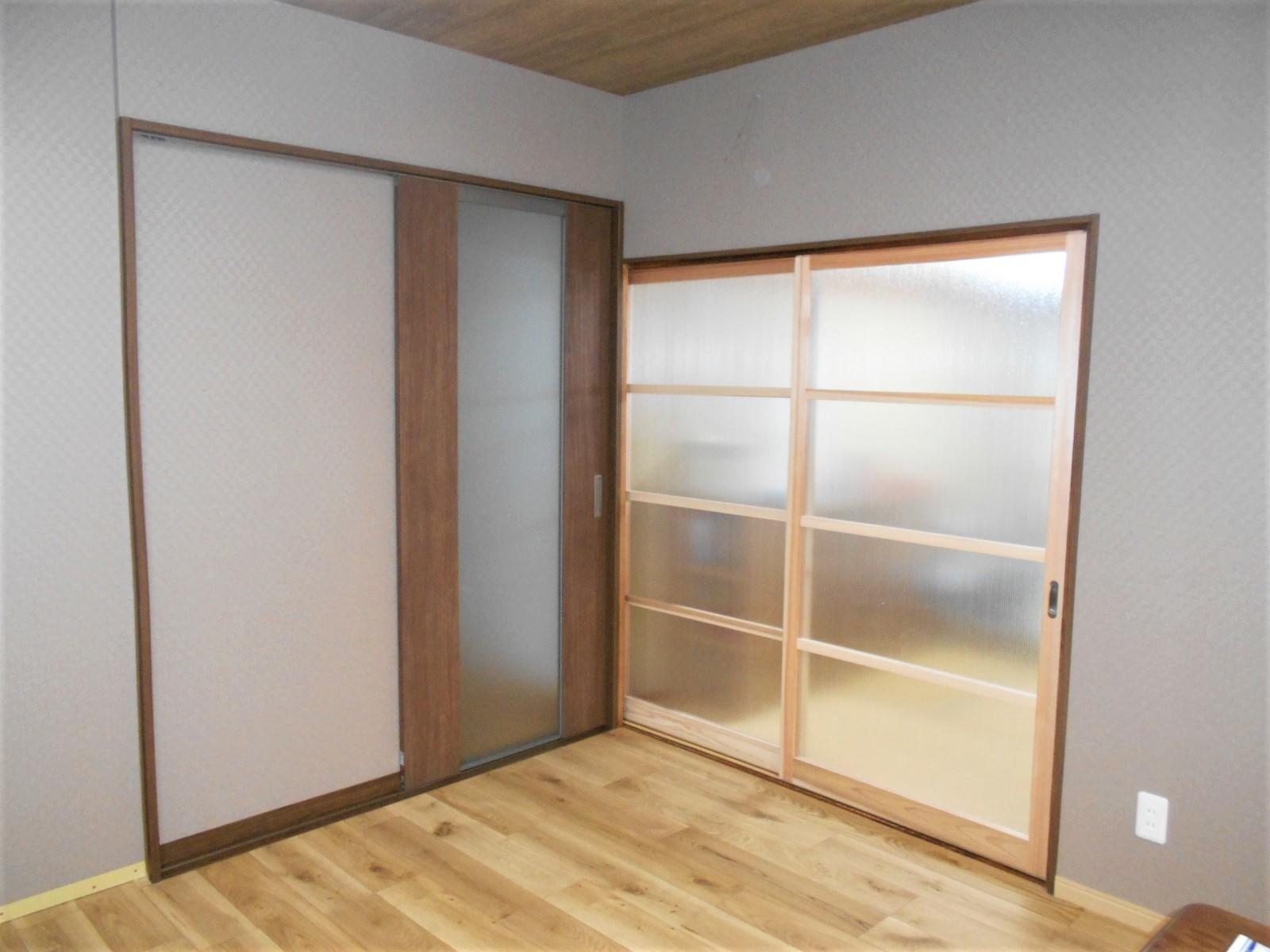 お施主様の娘さん家族と同居することになった為、今回台所や、他の部屋のリフォームをしたいとご依頼がありました。台所の建具交換と壁・天井・床のクロスの張り替えを行いました。和室側にはすりガラスの建具を、廊下側の建具には片引き戸を取り付けました。