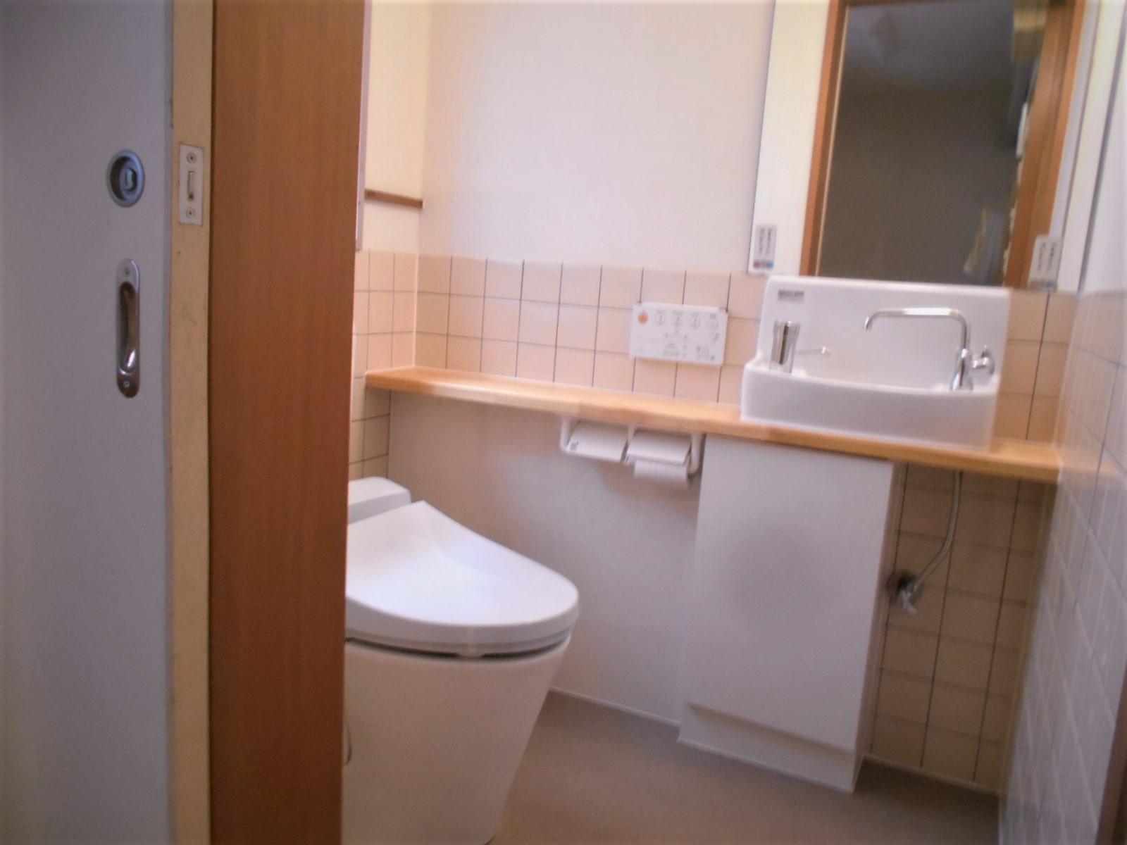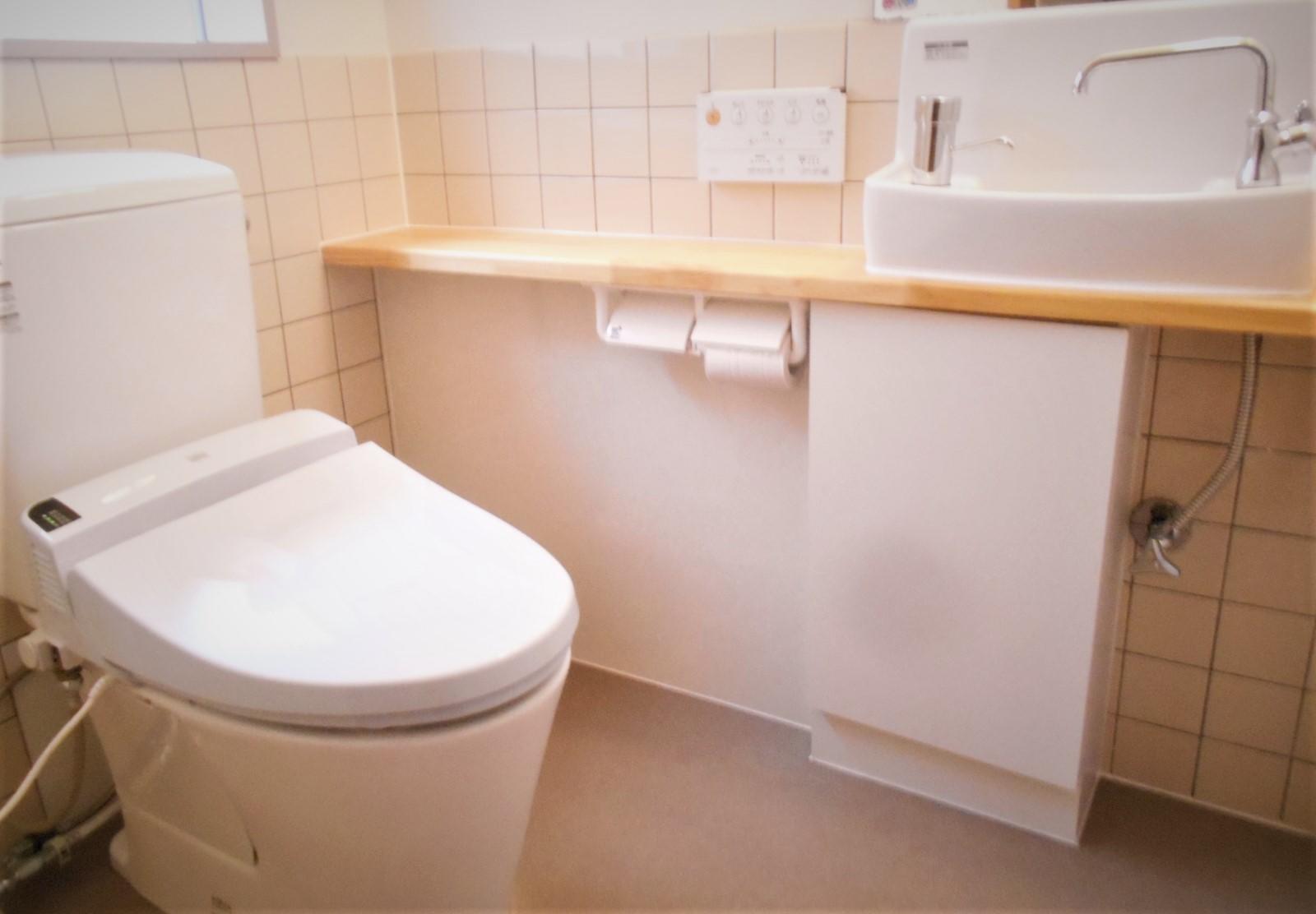 和式トイレは換気機能が弱く不衛生な感じがしたり、しゃがむ姿勢が体に負担をかけるなどの困りごとが多い為、和式トイレから洋式トイレへとリフォームされました。 和式の段差を解消し、便器の向きを変えたことで以前よりも広々とした空間になりました。 手洗器も新しく新設され、職人さんによって作られたカウンターによりスッキリ見栄えも良くなりました。