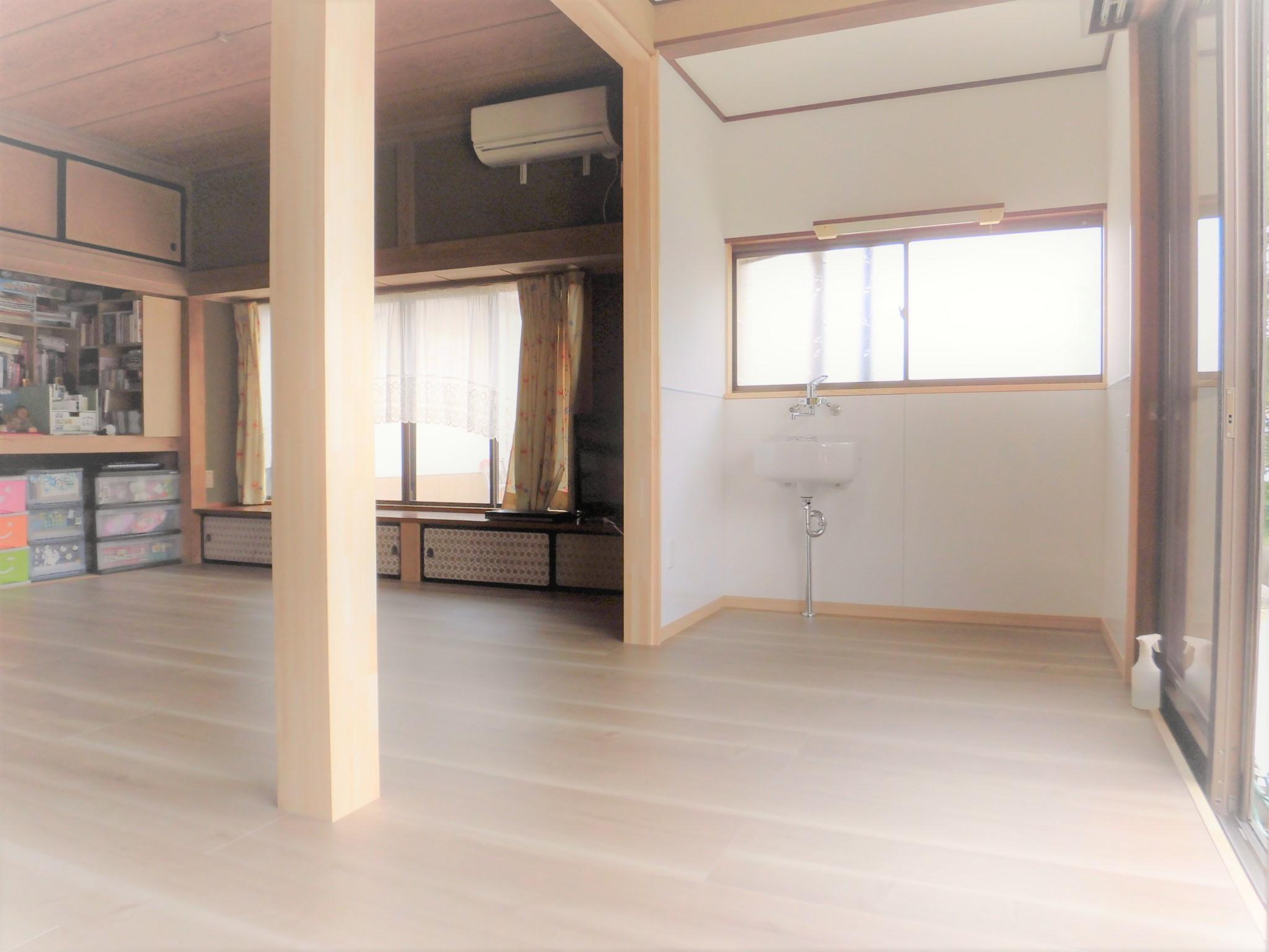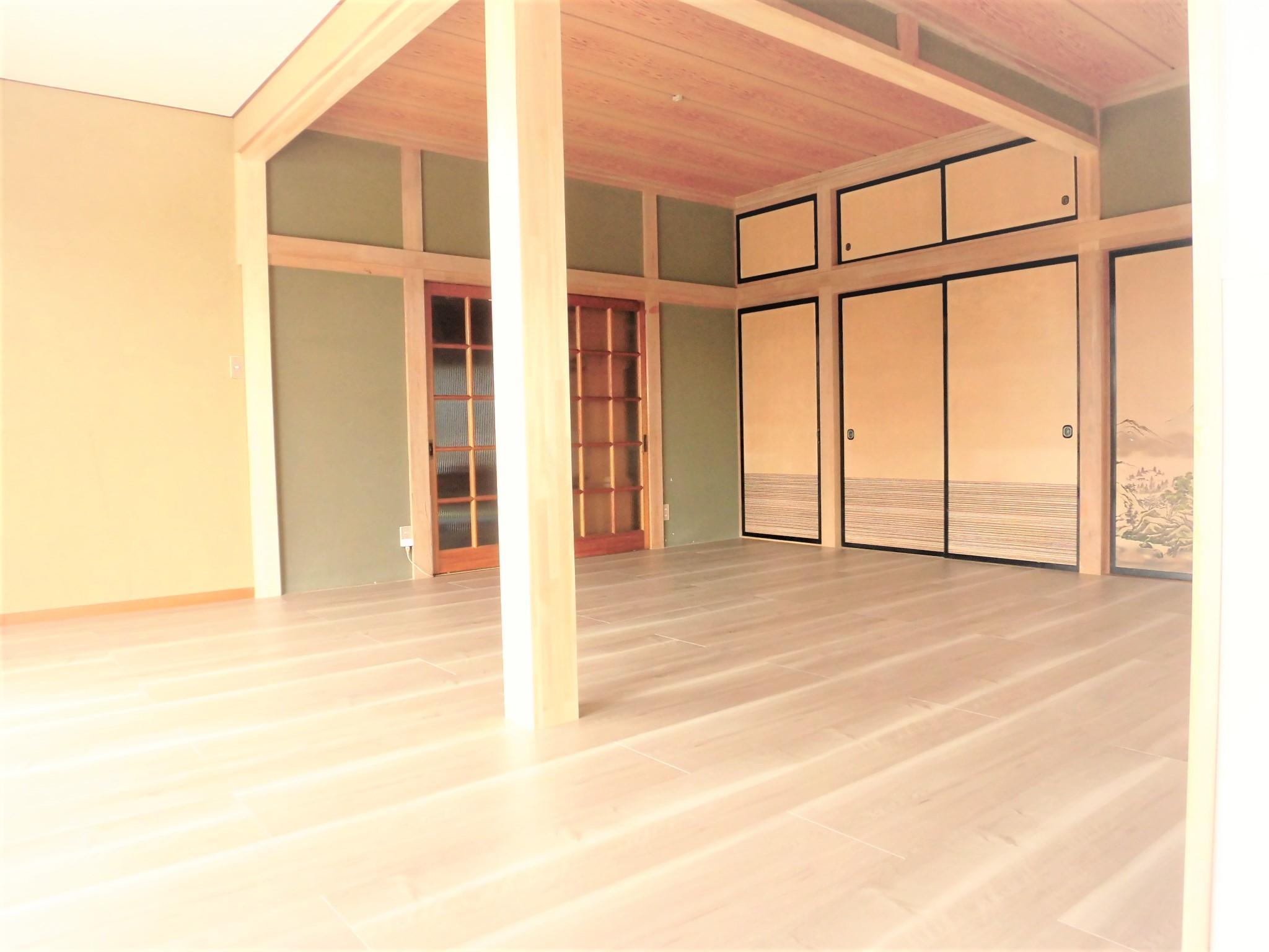 2部屋続きの和室を洋室リビング空間に変更。ワンちゃんに優しいフローリング材を採用して家族みんなでくつろげる空間になりました。