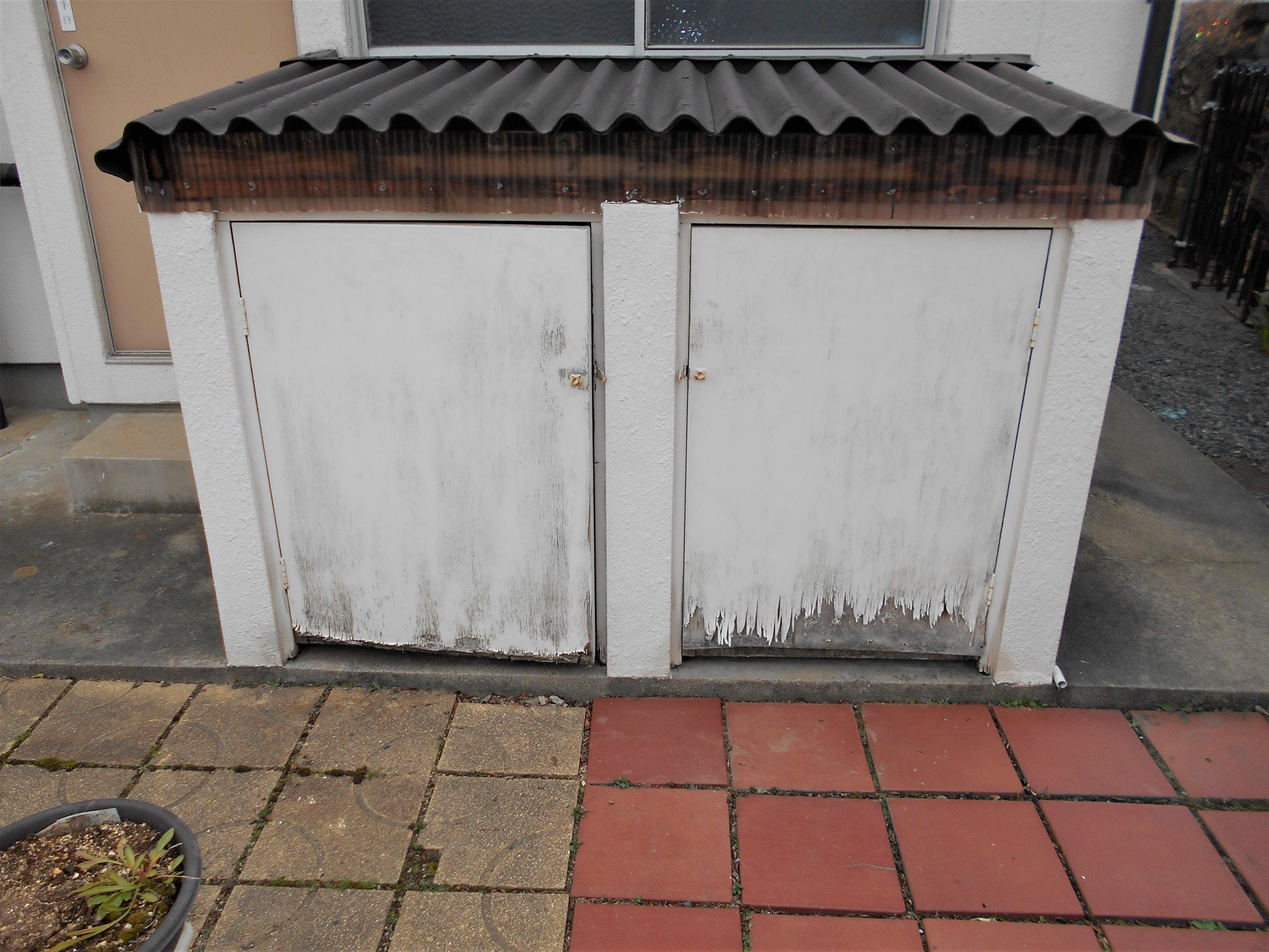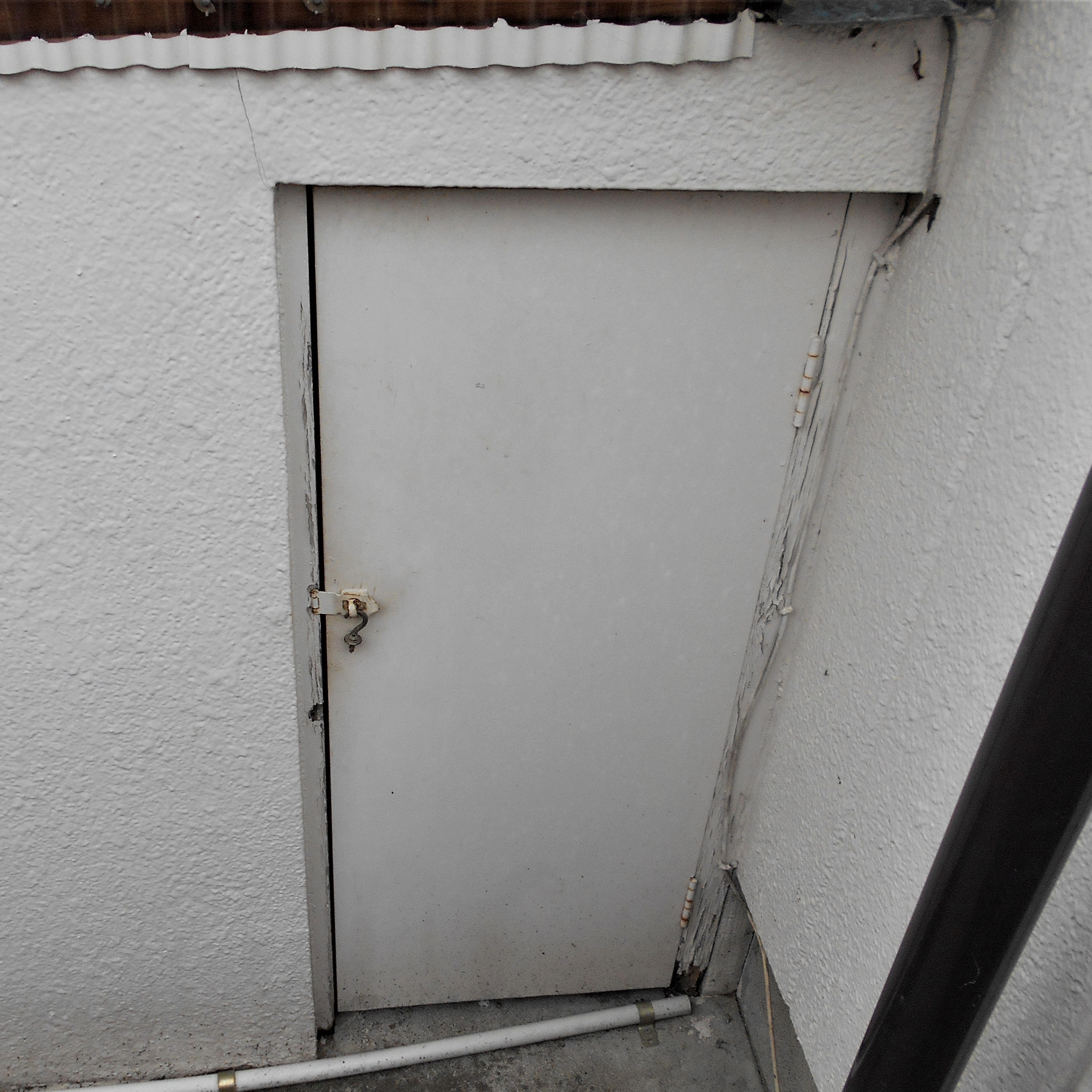 湿気や雨水の跳ね返りでボロボロになってしまった、物置の扉。そのままでは破損してしまう可能性や保管している物にまで影響が及びかねない状態でした。