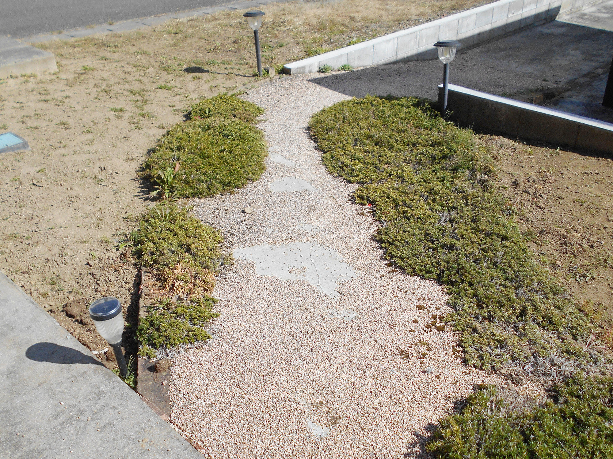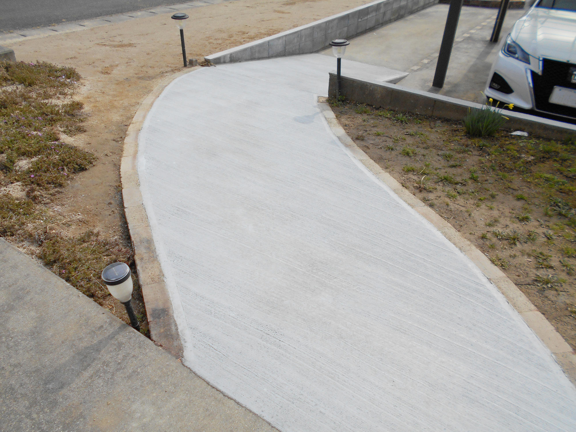 今回はスロープの作り直しを提案。劣化してしまった既存のスロープを撤去後、コンクリートを打ち直し。このスロープは、駐車場から玄関アプローチへとつながっているため、歩いたときに滑りにくいよう表面を刷毛引き仕上げとしました。刷毛引き仕上げは、刷毛などを用いて表面に凹凸をつける仕上げる方法。表面がザラザラになって滑りにくくなります。