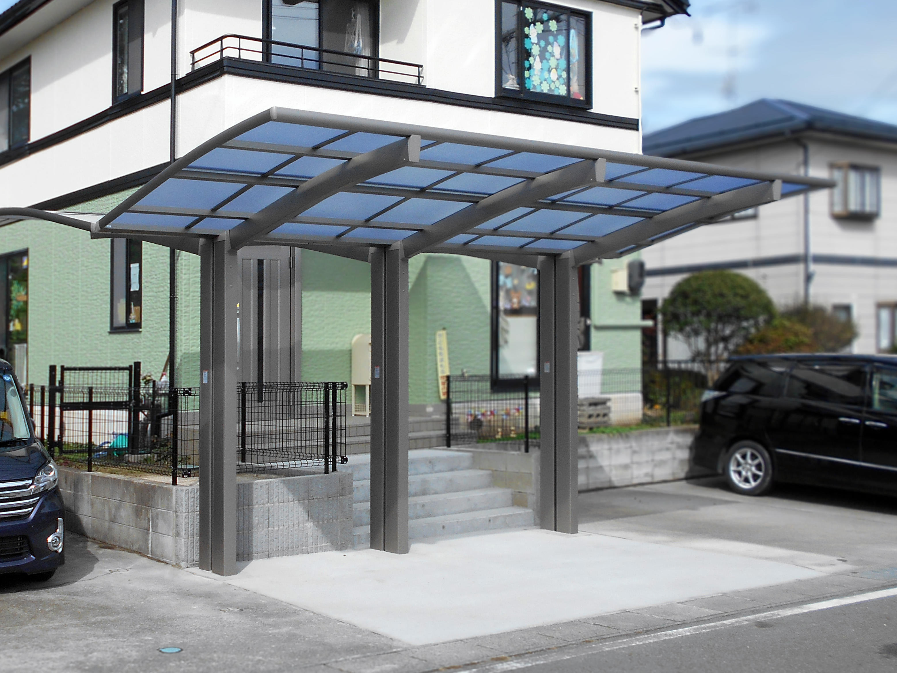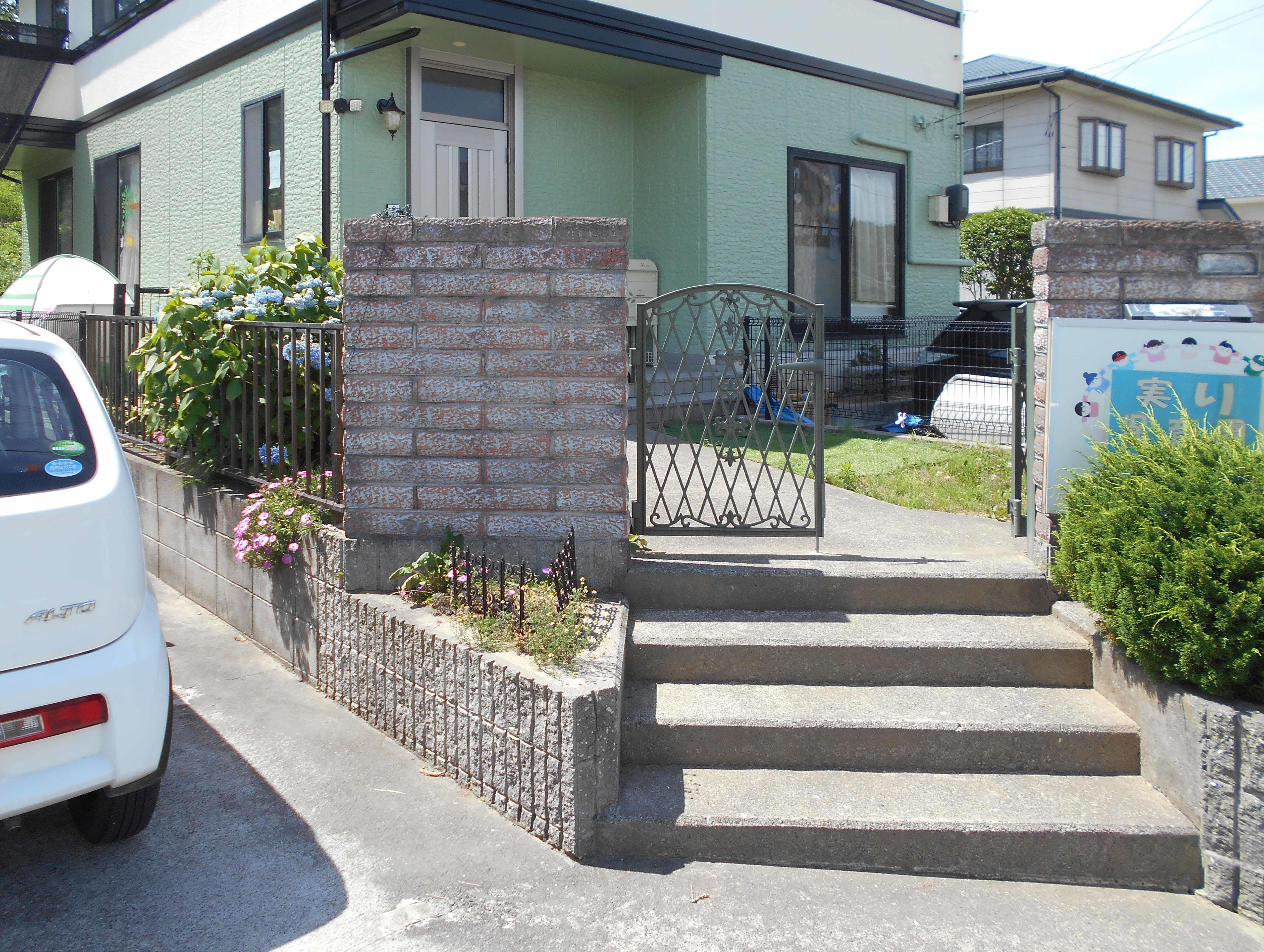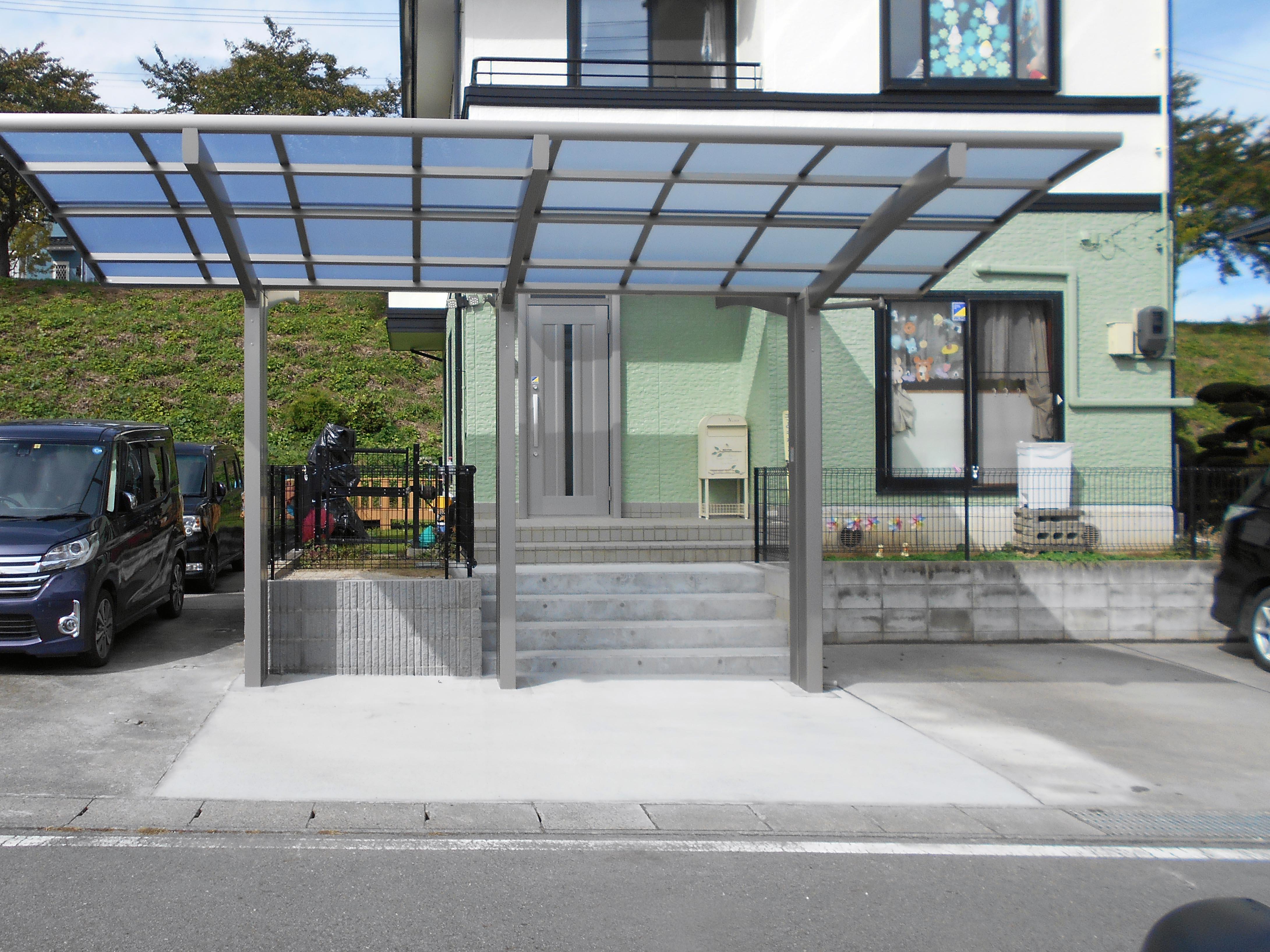 今回のリフォームでは、送迎車の駐車スペースと子どもたちの待合所の確保を目指しました。まずは、駐車スペースを確保するため、既存の玄関アプローチ階段を撤去後、位置を変更して新しいものに。階段幅も広くしたので、子どもと並んでもゆったり歩けるように。次に、子どもたちの待合所として、LIXILのカーポート「フーゴR Y合掌タイプ」を設置。玄関から車までの雨除けとしてはもちろん。柱が真ん中にあるので、車での出入り、ドアの開閉もしやすくなります。