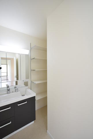 洗面化粧台の横に収納棚を設置。