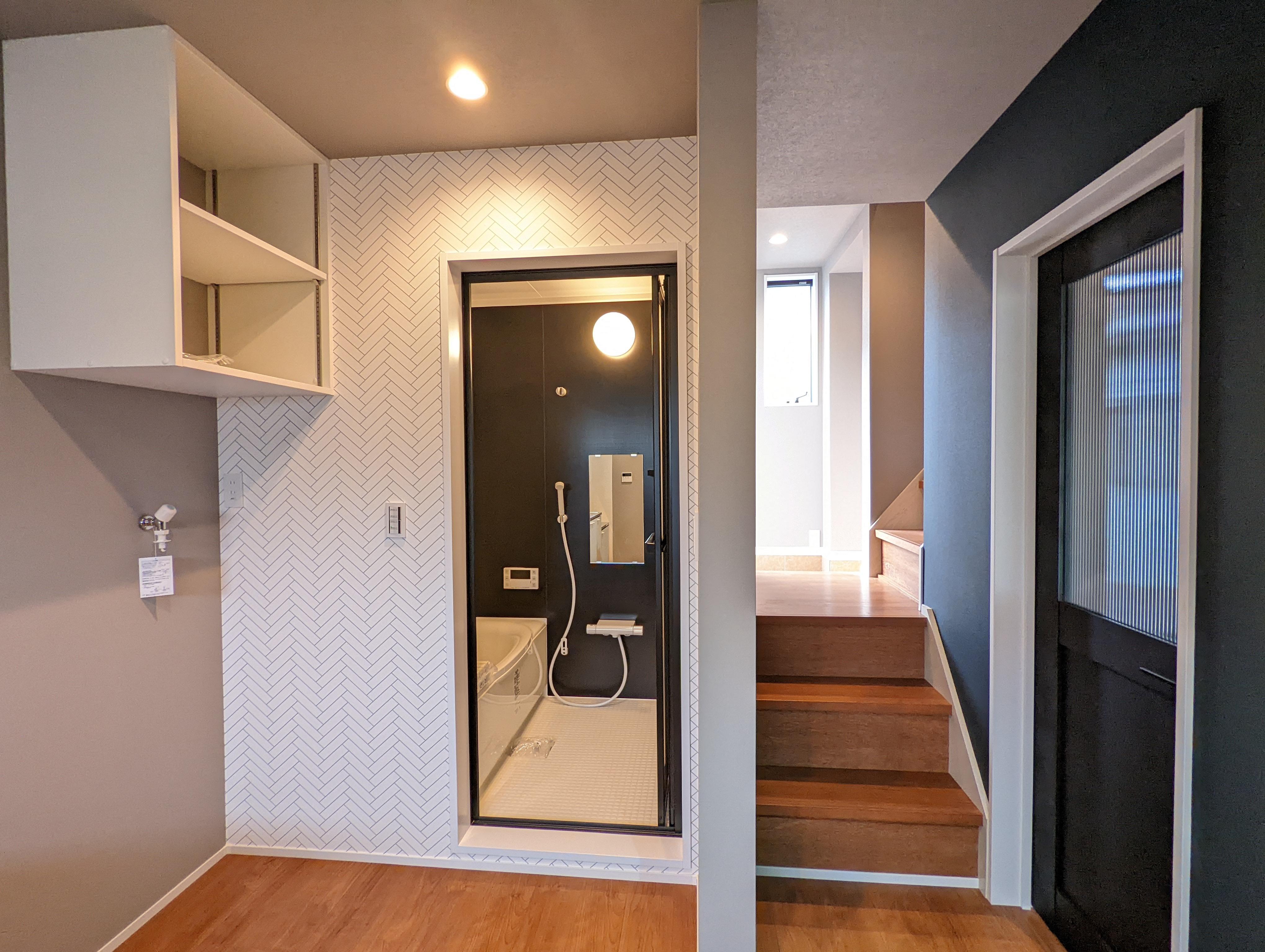 裏の玄関から入り、降りるとこのような水回りが集約された空間となります。中2階仕立てにすることで、冷蔵庫や洗濯置き場の置くスペースを確保しました。収納スペースだったところをユニットバスに変更して、水回りを集約しました。店舗横にキッチンや水回りがあるので、仕事もプライベートも効率よく過ごせます。内装のクロスは、外観と同じ配色でベースのグレーとマットな質感のモダンな印象のネイビーで統一しました。色味を絞っているので、すっきりとした印象です。デザイン性の高いペンダントライトをポイントで取り付けたことで空間が引き締まりました。洗濯置き場の上は、造作の可動棚を設置しました。タオルや洗剤などもサイズに合わせて棚板の位置を変えられますし、洗濯機上の空いたスペースの壁面の有効利用に大変おすすめです。
