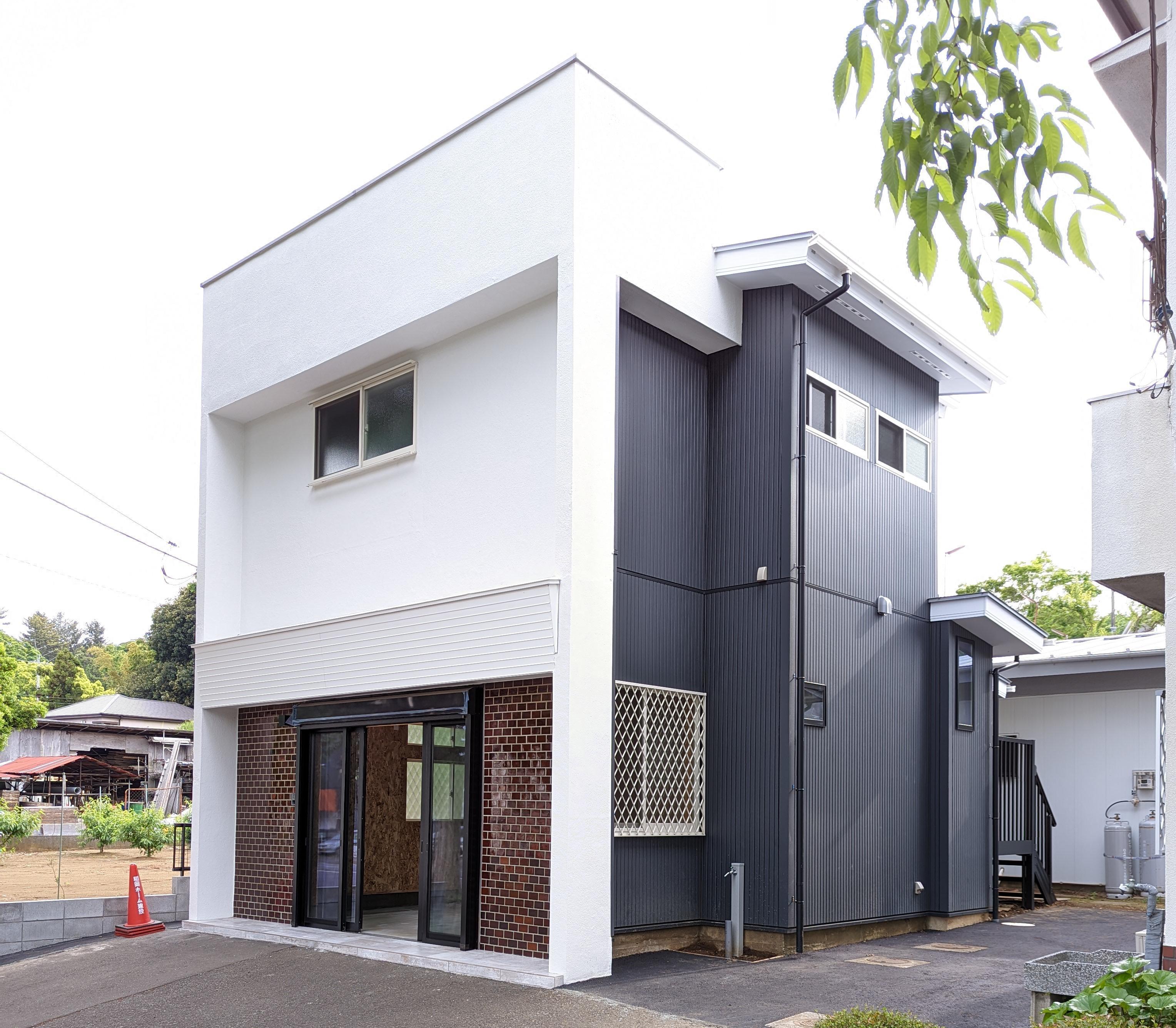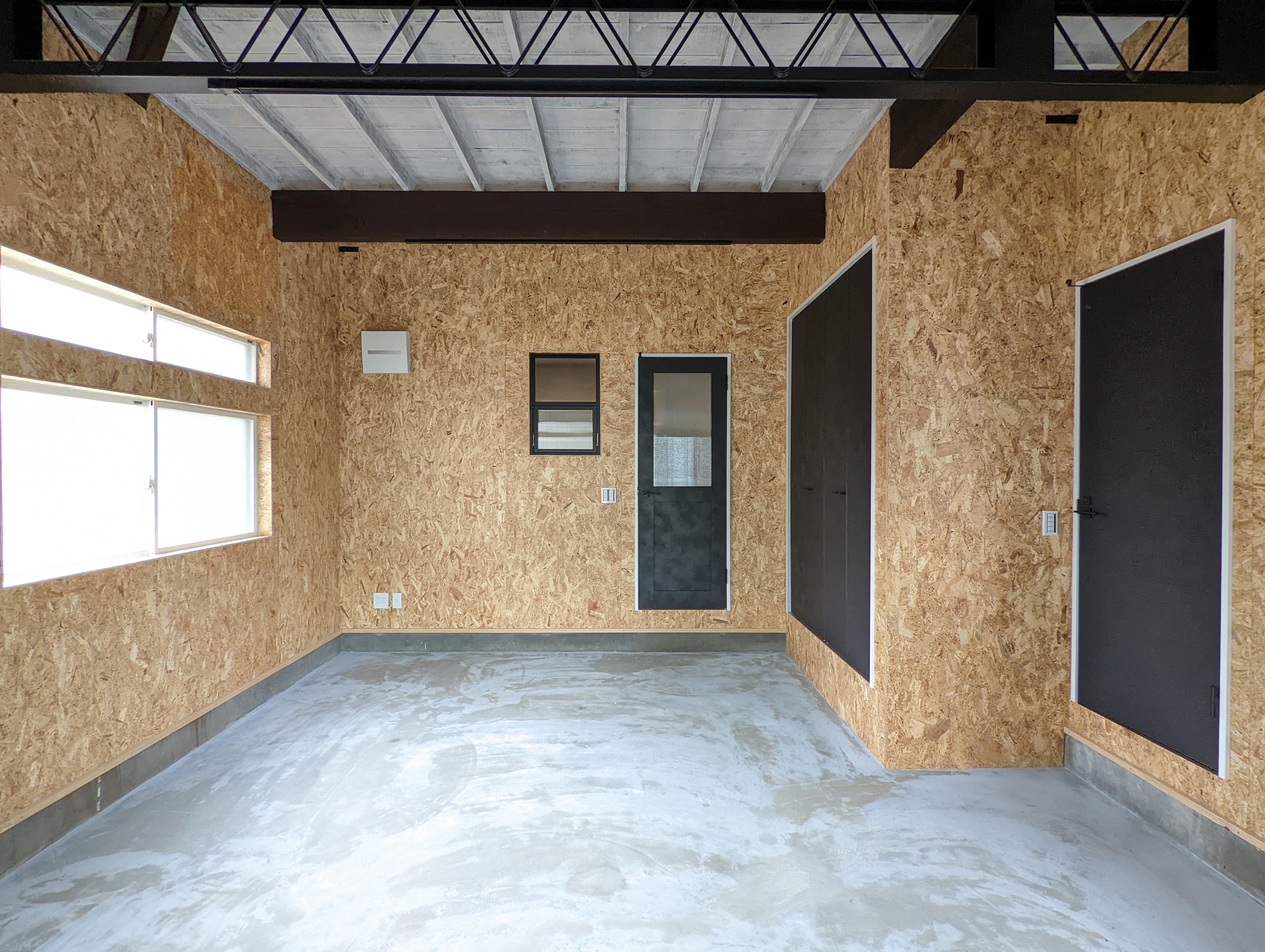 店舗は、天井にある梁を出して塗装しスケルトン構造にしました。空間を広げるとともに、デザイン性のある鉄骨の梁を見せることでモダンな空間を生み出しました。あえて隠さないことで梁をデザインの一部に取り込みました。よく見ていただくと梁の部分は、鉄の梁部分をブラック、大梁と火打ち梁はダークブラウンで色分けをしています。細かいことですが、見た時の印象が単調にならないように工夫しています。ムラがあるように塗った天井板とのラフな印象と程よくマッチしています。壁は、OSB合板を採用しました。もともと構造用の建材でしたが、圧縮された木片の独特な素材感と風合いを活かし、あえて内装材として使用するケースも増えています。インパクトの強い個性的なインテリアに取り入れられることが多いですが、OSB合板の色合いや面積によっては、ナチュラルな優しい雰囲気を演出することも可能です。