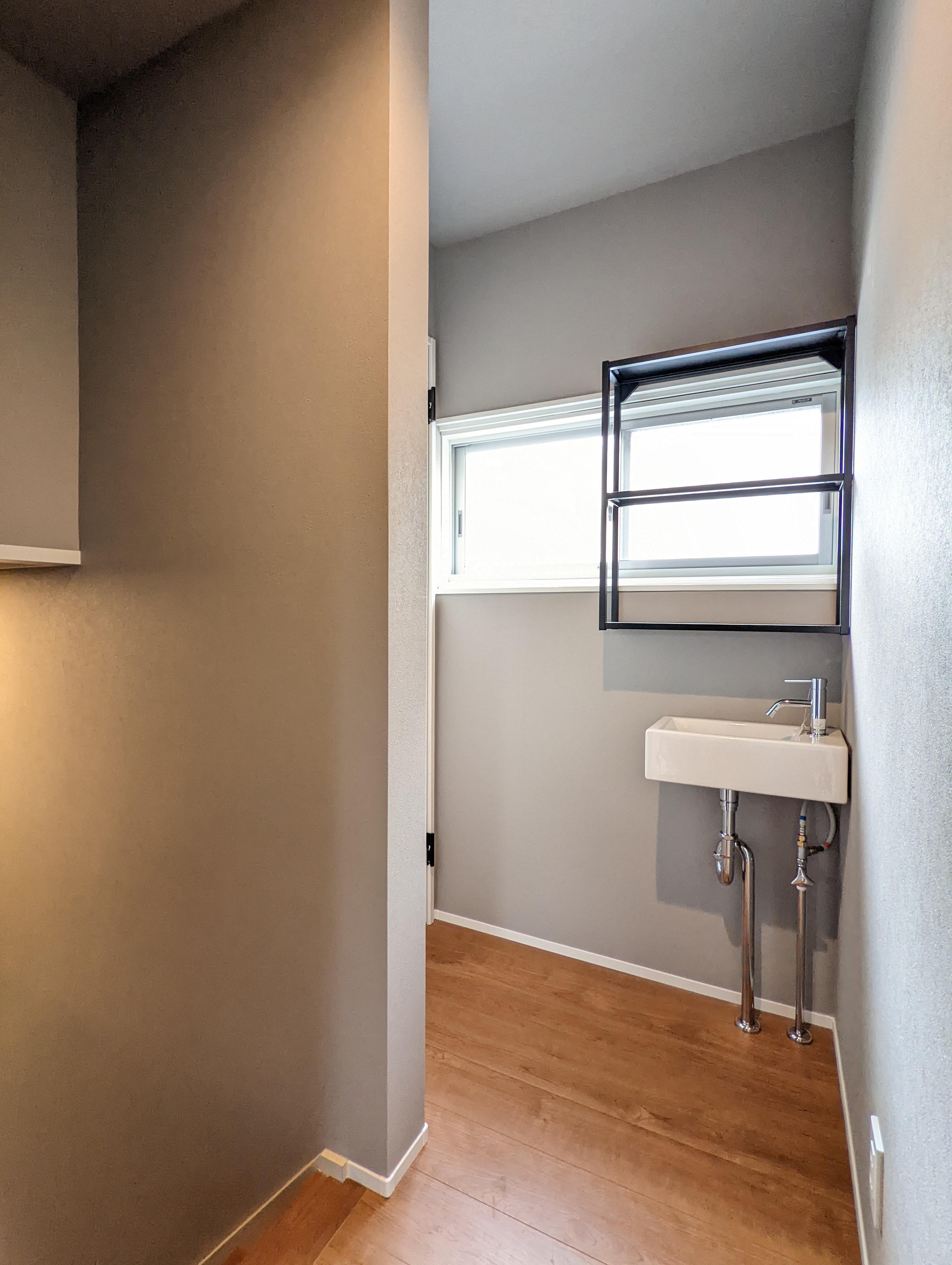 2階には手洗いコーナーがありましたので、設備の交換を行いました。2階に手洗スペースがあると、ちょっとした掃除にもすぐに水が使えてとても便利です。新しく取り付けたものは、サンワカンパニーの「ホックスミニ壁付けDX」です。コンパクトな形状で邪魔にならず、丸みを帯びたデザインは優しい印象です。また水回りのものを置くスペースに、施主様支給品のイケアのオープン収納ラックを取り付けています。ブラックのシンプルなフレームは、圧迫感がなくデザイン性もあり、手洗いコーナーのポイントになりました。