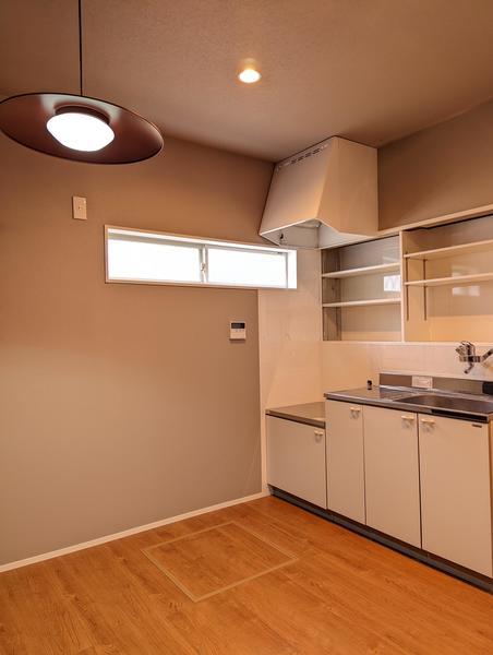 既存のキッチン設備を活かしながらも細部にこだわり、新しい空間に生まれ変わりました。採光を考えながら窓を小さくしていますが、小さくても効果的な位置にしたことで明るいキッチンになりました。こちらにダイニングテーブルを置くことを想定して、ペンダントライトを配置しました。