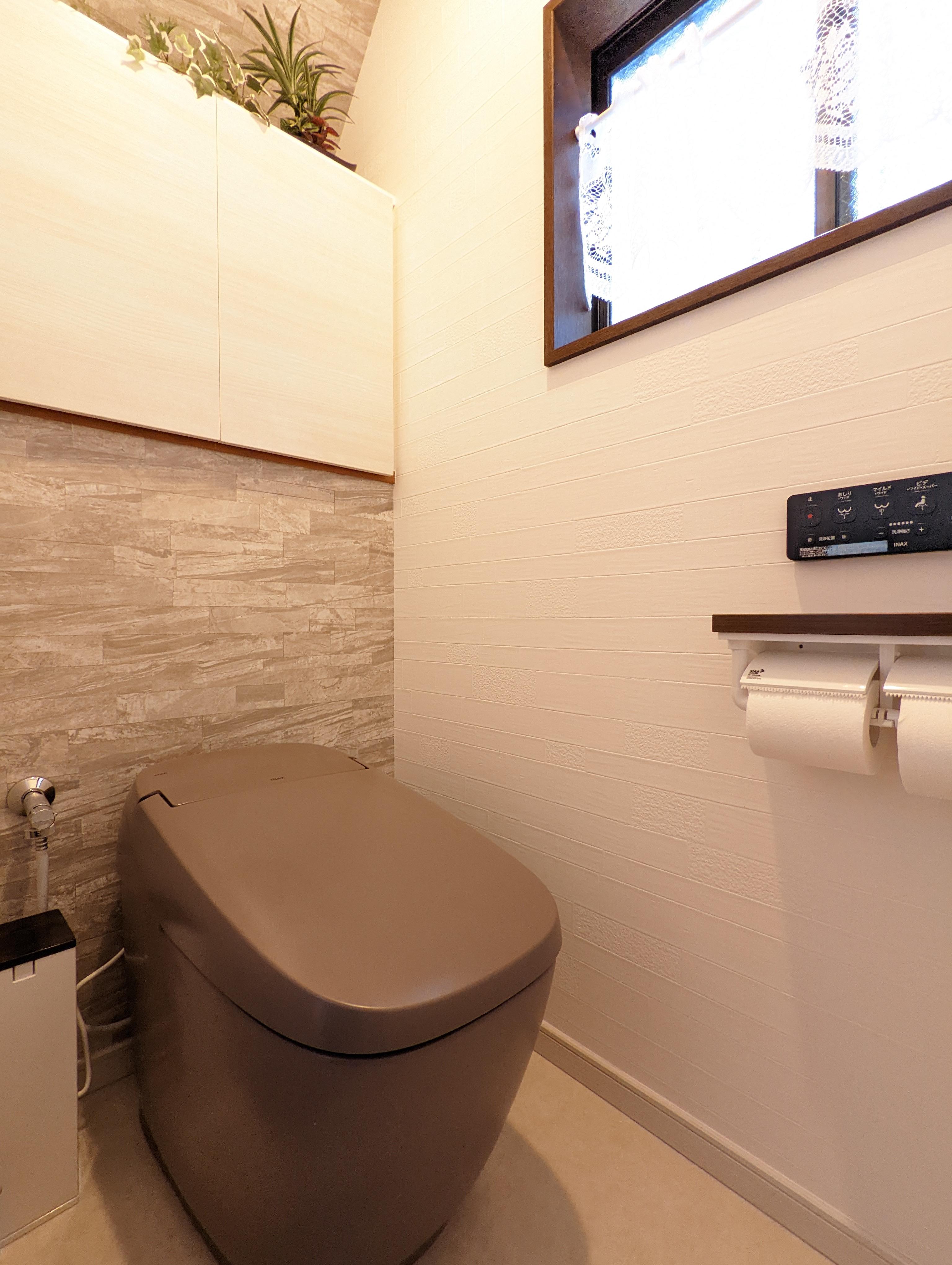 その便器背面には、ノーブルトーブのお色味をが入ったサンゲツのアクセントクロスRE53322で、コーディネートされたシックでおしゃれなトイレ空間に!