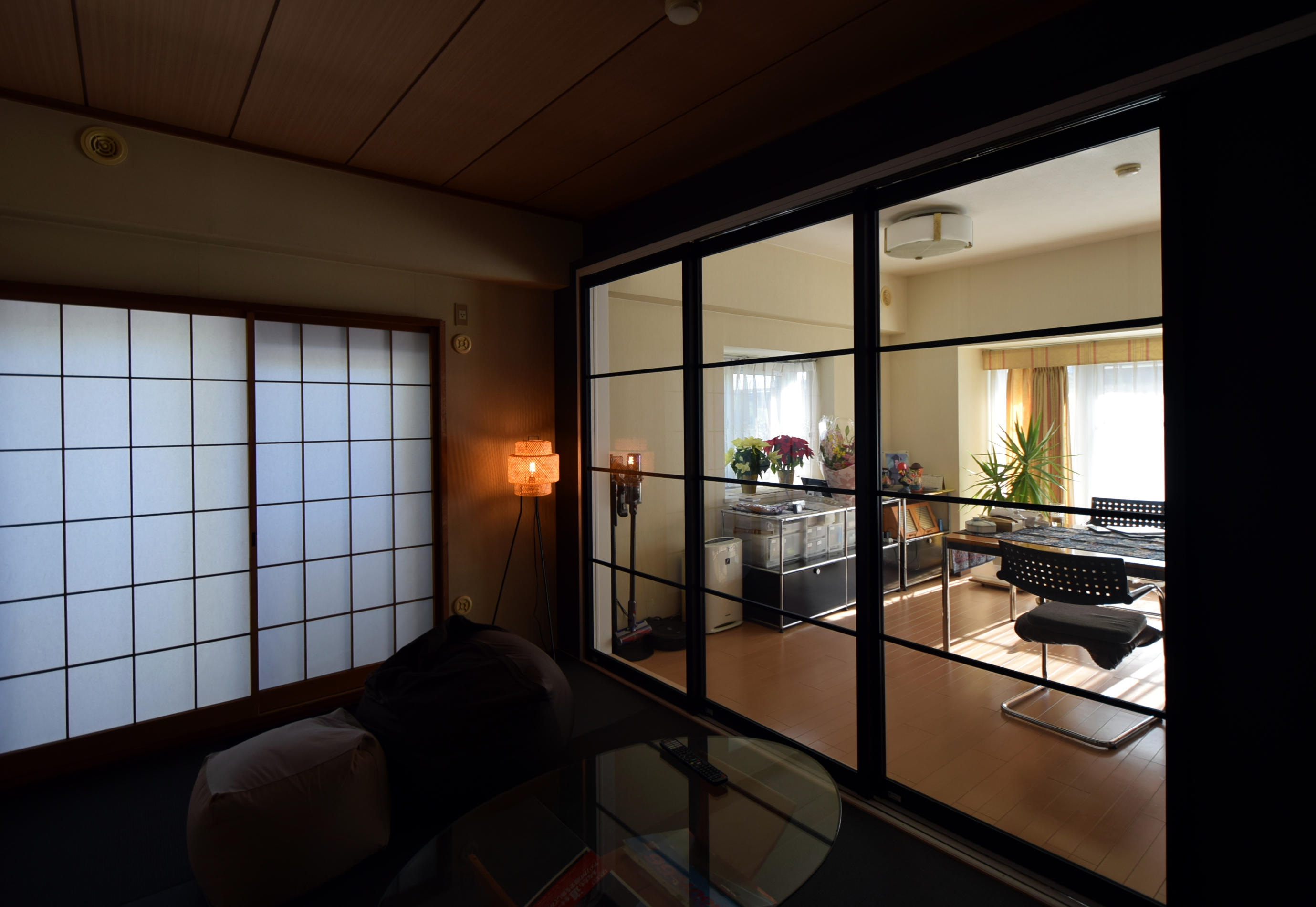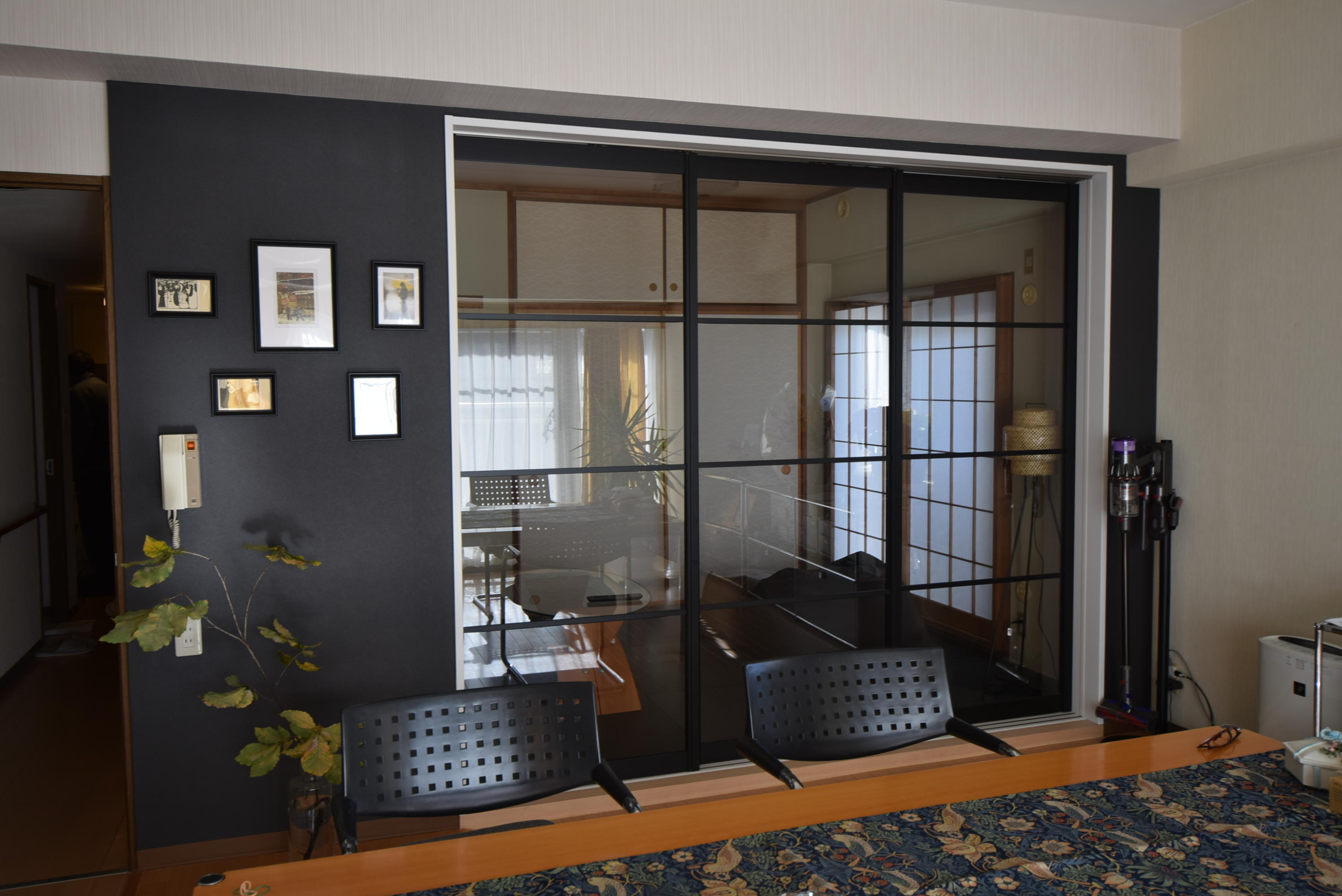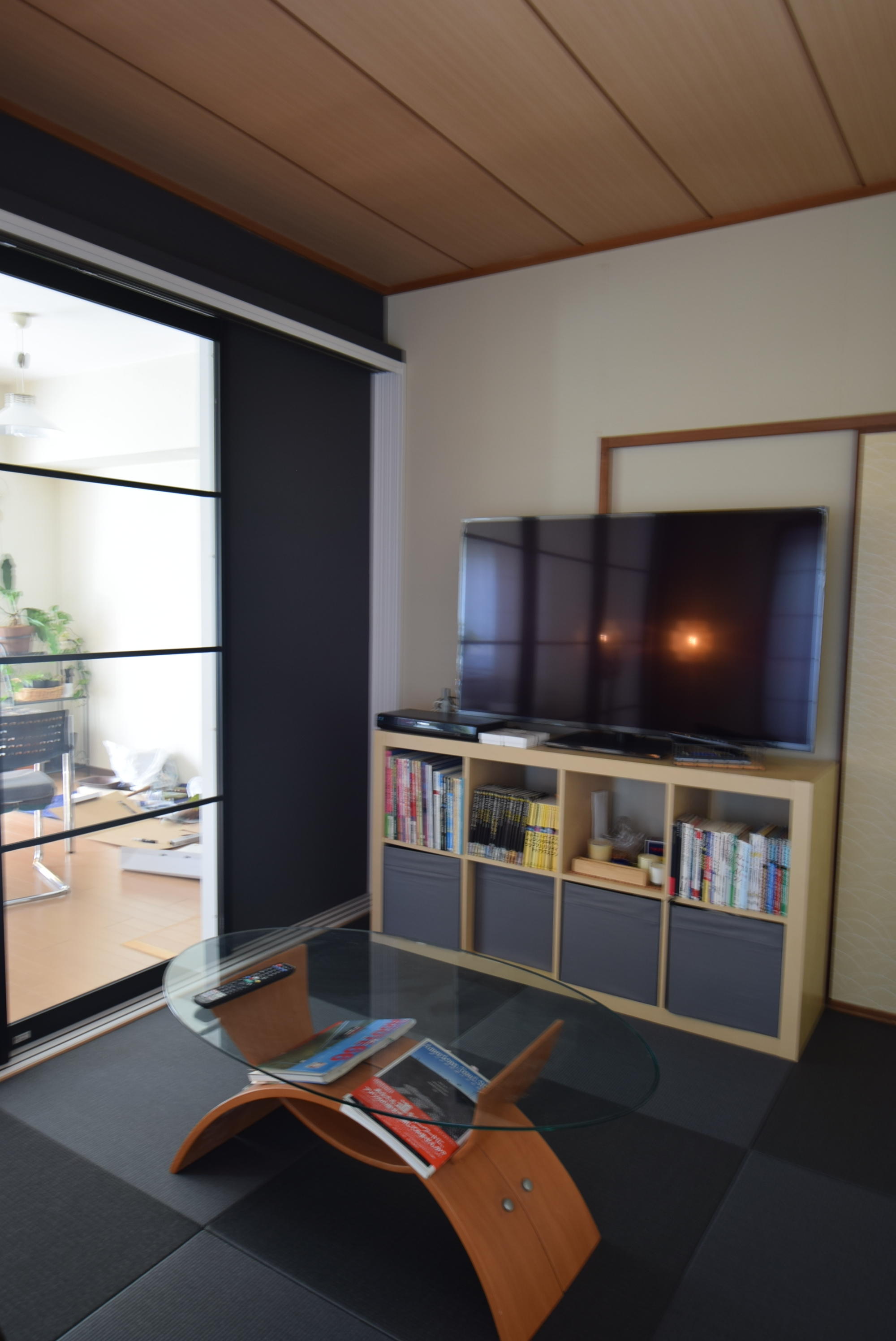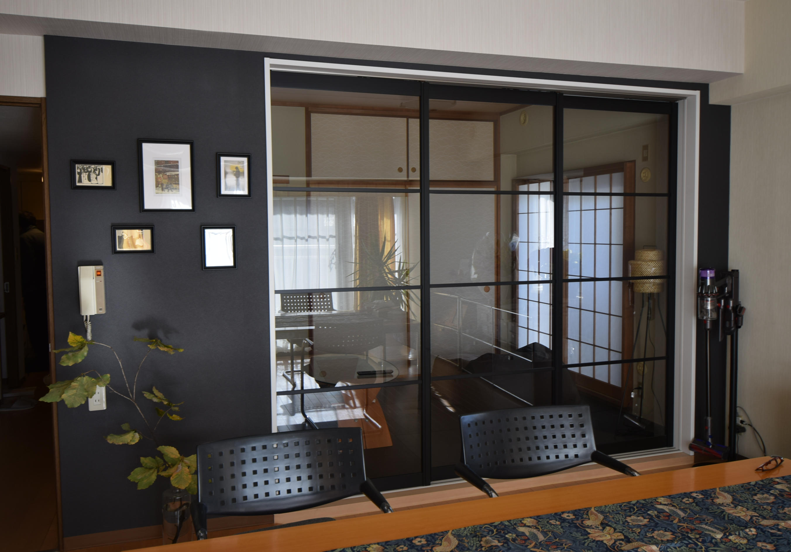 リビング横の和室を撤去せず、アルミフレーム+採光で開放的なデザインの間仕切りとブラックの畳で和モダンに。