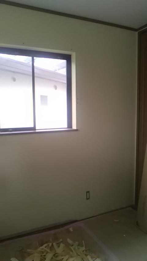黄色の壁紙に、茶系の巾木、廻り縁は