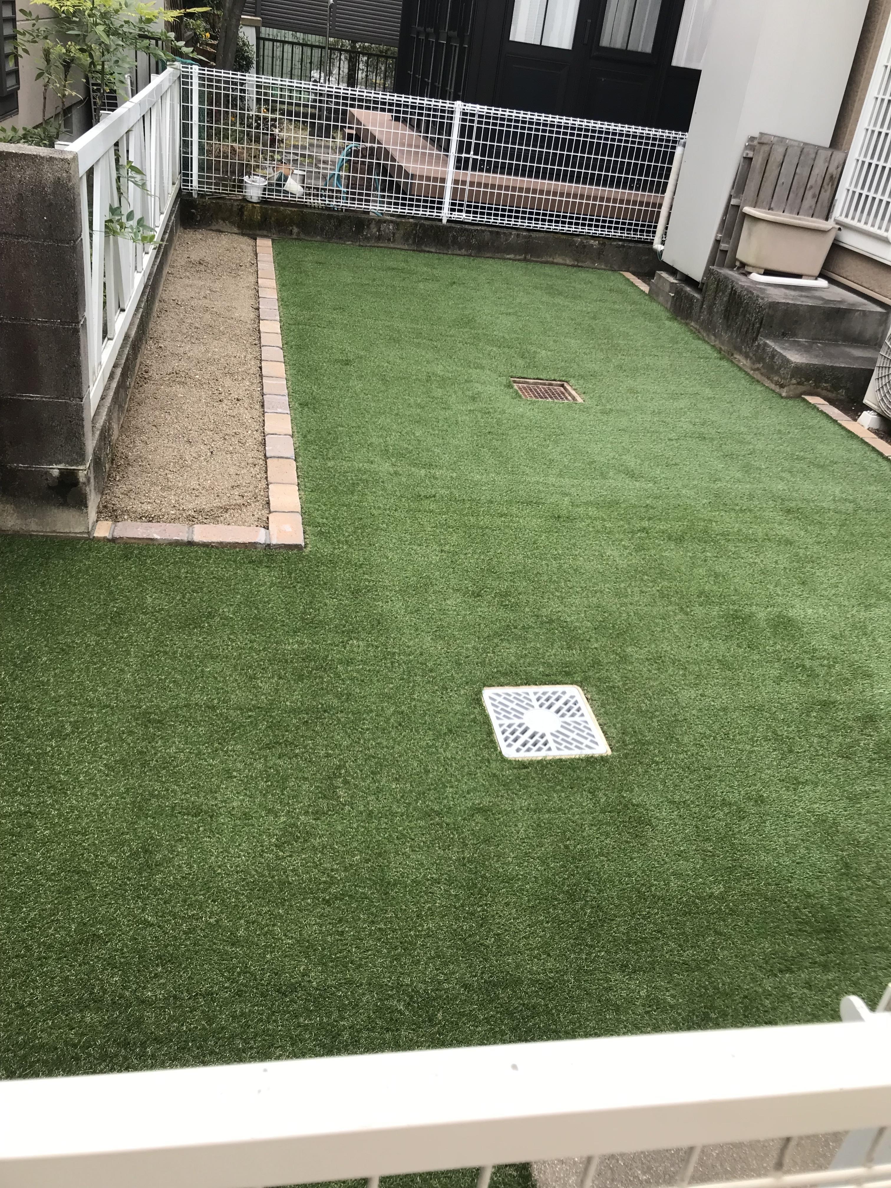 少し花壇も残して全面に人工芝を敷きました。これから花壇に花を植えるのが楽しみです。