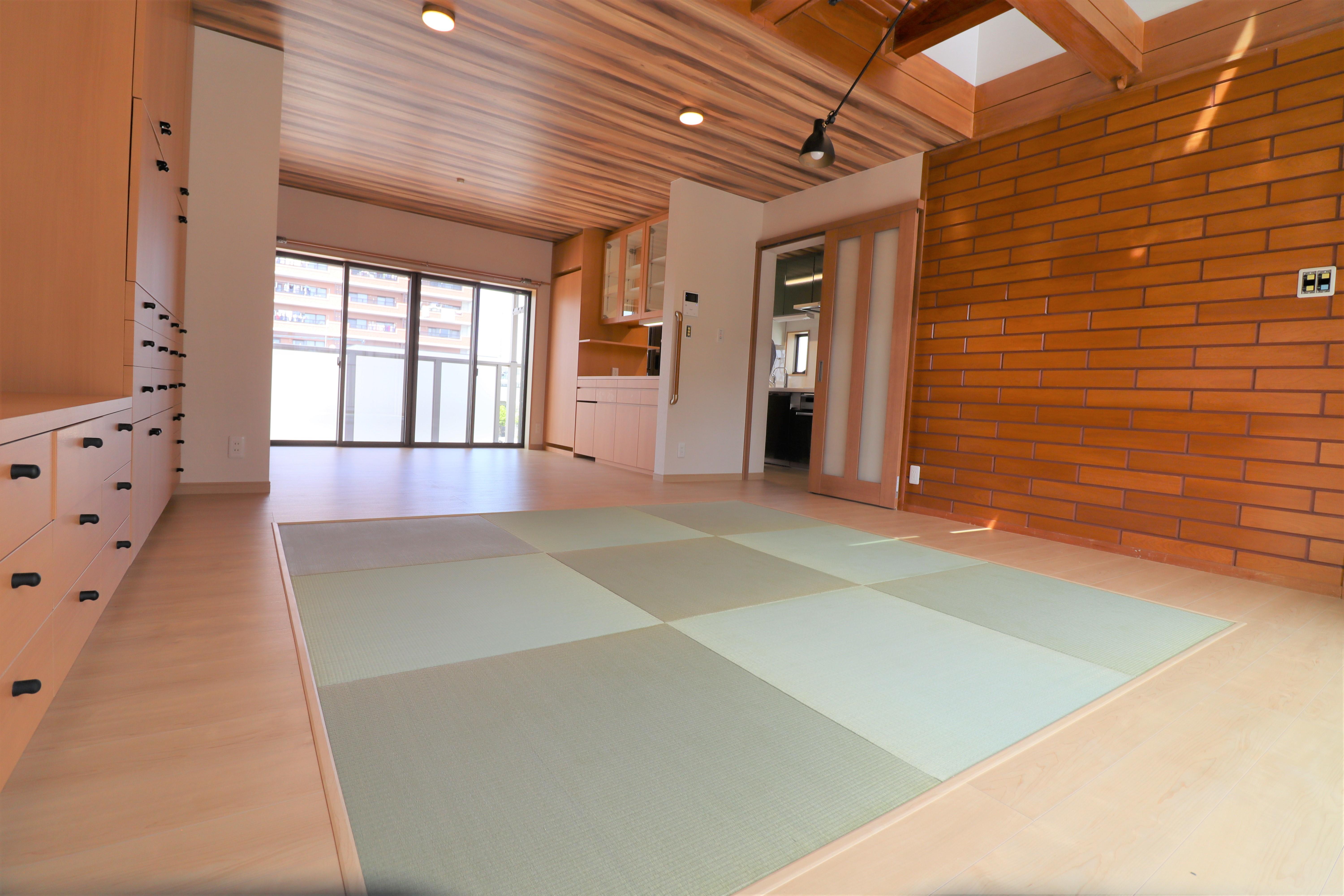 お施主様は木の雰囲気のある建物がとてもお気に入りでしたので、その元々の雰囲気を残してリノベーション工事をすることに大変気を遣いました。特に3階の床の一部がすのこ状となっていて、家族の皆様がくつろぐ2階リビングに明るい陽射しが届くようにすることに苦心致しました。