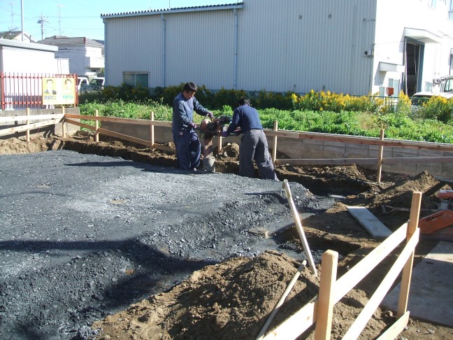 基礎が沈まないように、十分に転圧を行います。