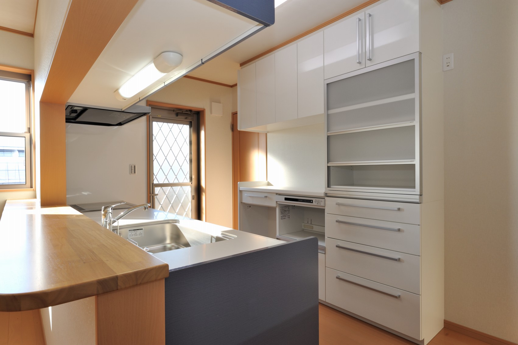 使い勝手の良い、TOTOシステムキッチン。 スライド式の食器棚はとても便利!