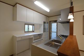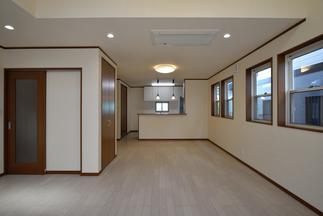 対面キッチンとダイニングテーブルのつながりで、家族の気配を感じる事ができる安心感いっぱいの空間。使いやすい間取りと広めのリビング。