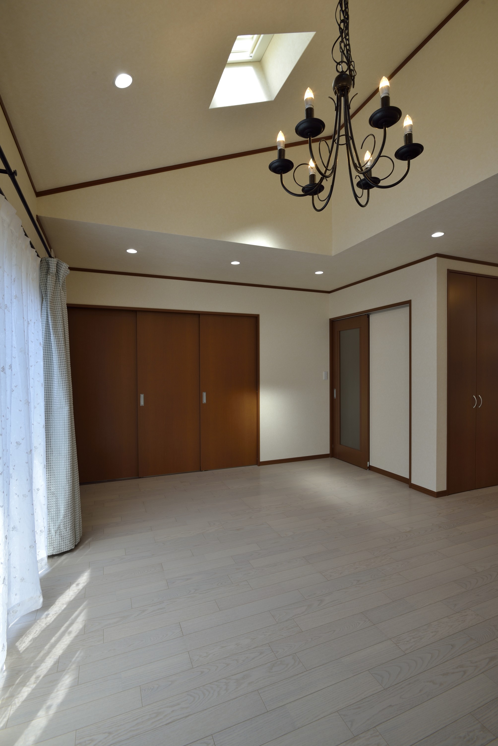 リビングには自然光が降り注ぐ天窓に加え、間接照明もあり、部屋の落ち着きを映しだしてくれます。正面の3枚引き戸は、和室の入口になります。
