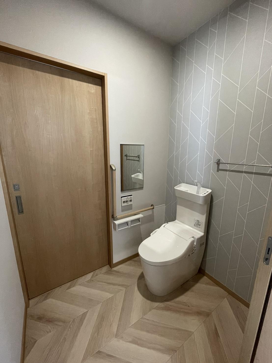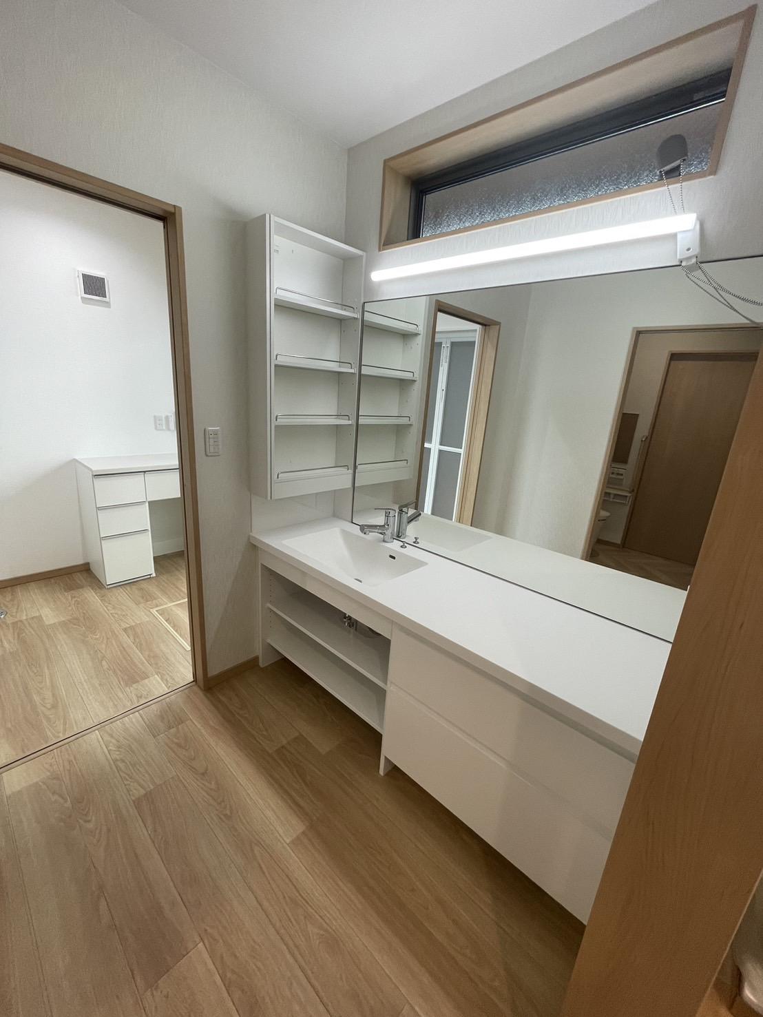 1坪分の空間をとり、大きな鏡を採用。その効果も相まって広く感じる作りに。明るく、収納も多い便利な洗面所となりました。