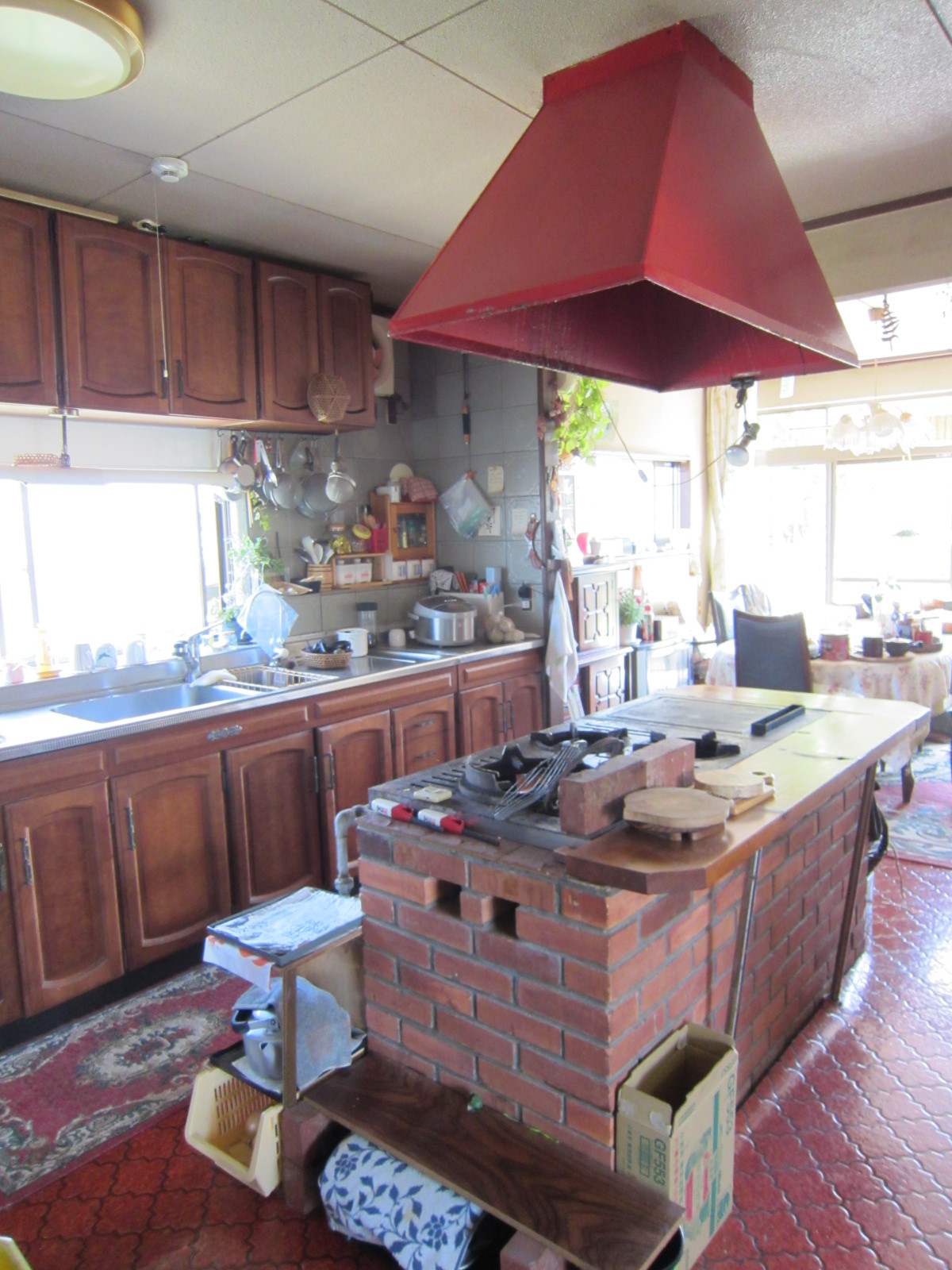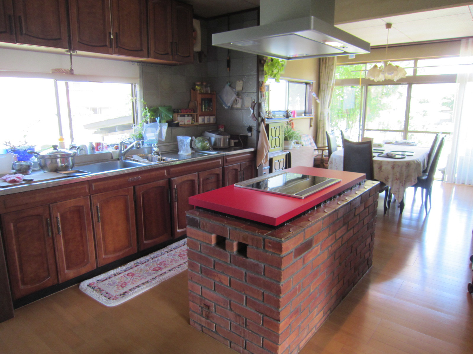 新築した当時、主人がこだわってデザインしてくれたキッチン。40年が経ち、今回IHクッキングヒーターに交換しました。 オーダーのIH調理台は、こだわりの赤。調理台には引出もたくさんあるので、台の上はいつもスッキリした状態にしておけます。新しい換気扇のおかげで、キッチン周りがベタベタせず、お掃除も簡単です。 キッチンに立つのが楽しくなりました。新しくなったキッチンでも、お友達を呼んでホームパーティーを楽しみたいです。