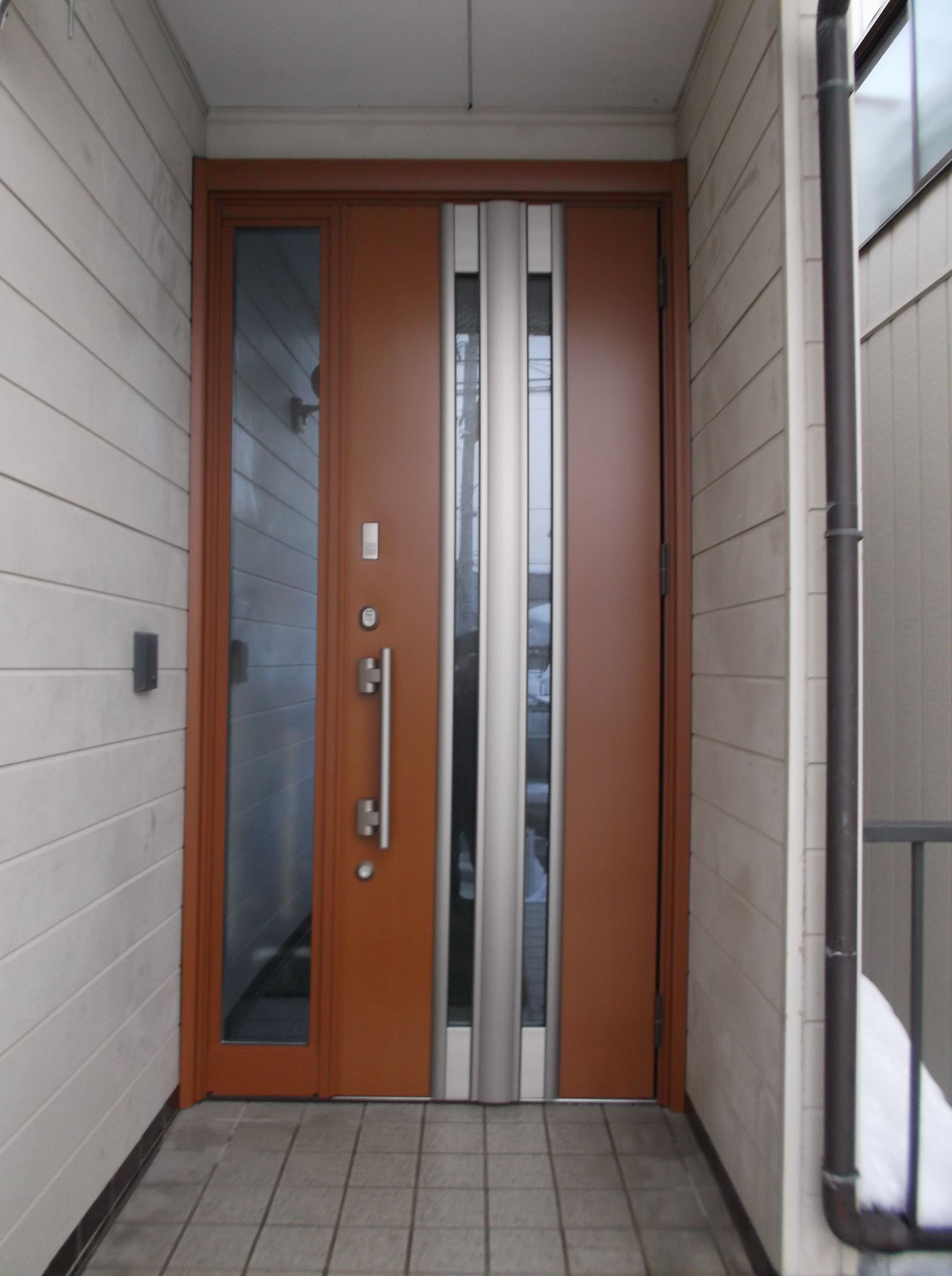 築30年以上の我が家の外観が、パッと明るくなりました。以前は玄関からの冷気が気になってました。交換してからは室内の空気が逃げなくなったようで暖かく感じられとても気に入ってます。 工事内容は1日だけのサッシ屋さんの工事で、何日にもかかって気遣いするということもなく済みました。 床に変な段差などつくこともなく、今までと同様に安全に出入りができます。ありがとうございました。