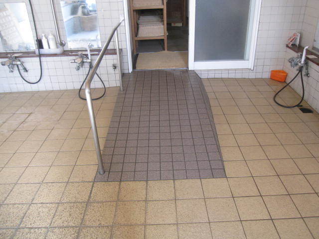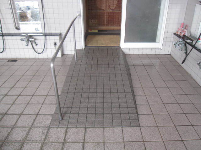 豊富な湯量で有名な米沢市小野川温泉。その中の一つ「登府屋旅館」さんの大浴場の入り口に、スロープと手すりを取り付けました。入浴介助の必要な方や車いす利用の方でも安心して利用できる大浴場になりました。