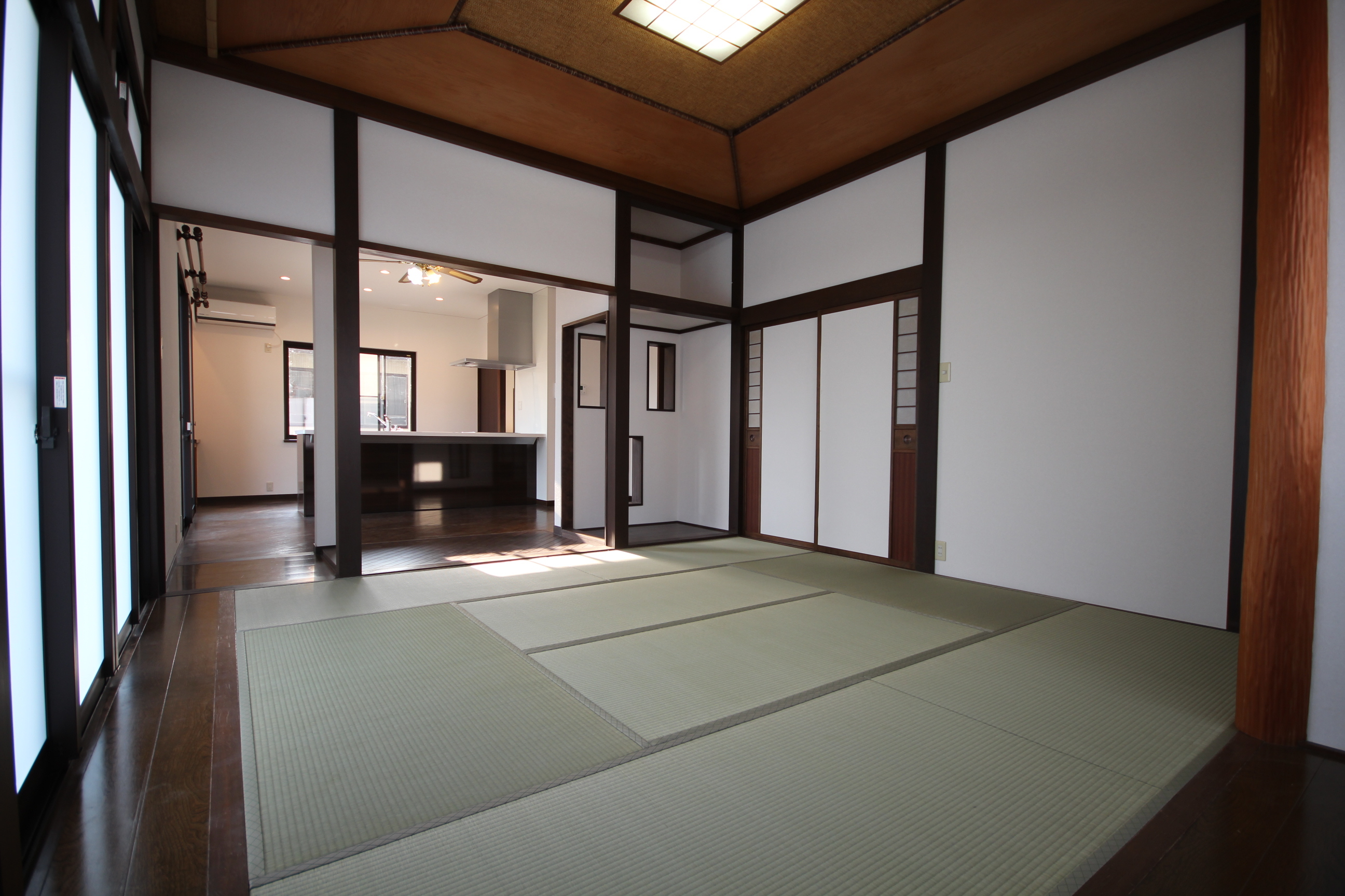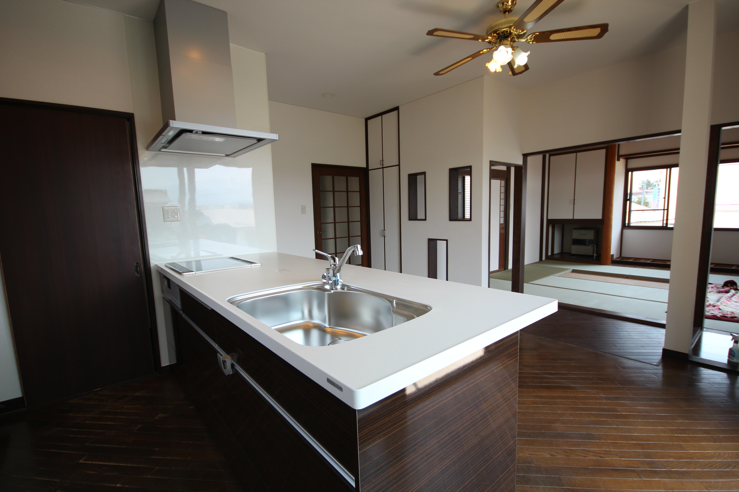 中古住宅を購入され、リフォーム工事を担当させていただきました。リビングと和室の間にあった壁を取り、大事な柱だけを残し大きなリビングになりました。そこへ水まわりを移動してキッチンを新設することにより、家族が集える広く明るい空間へと生まれ変わりました。