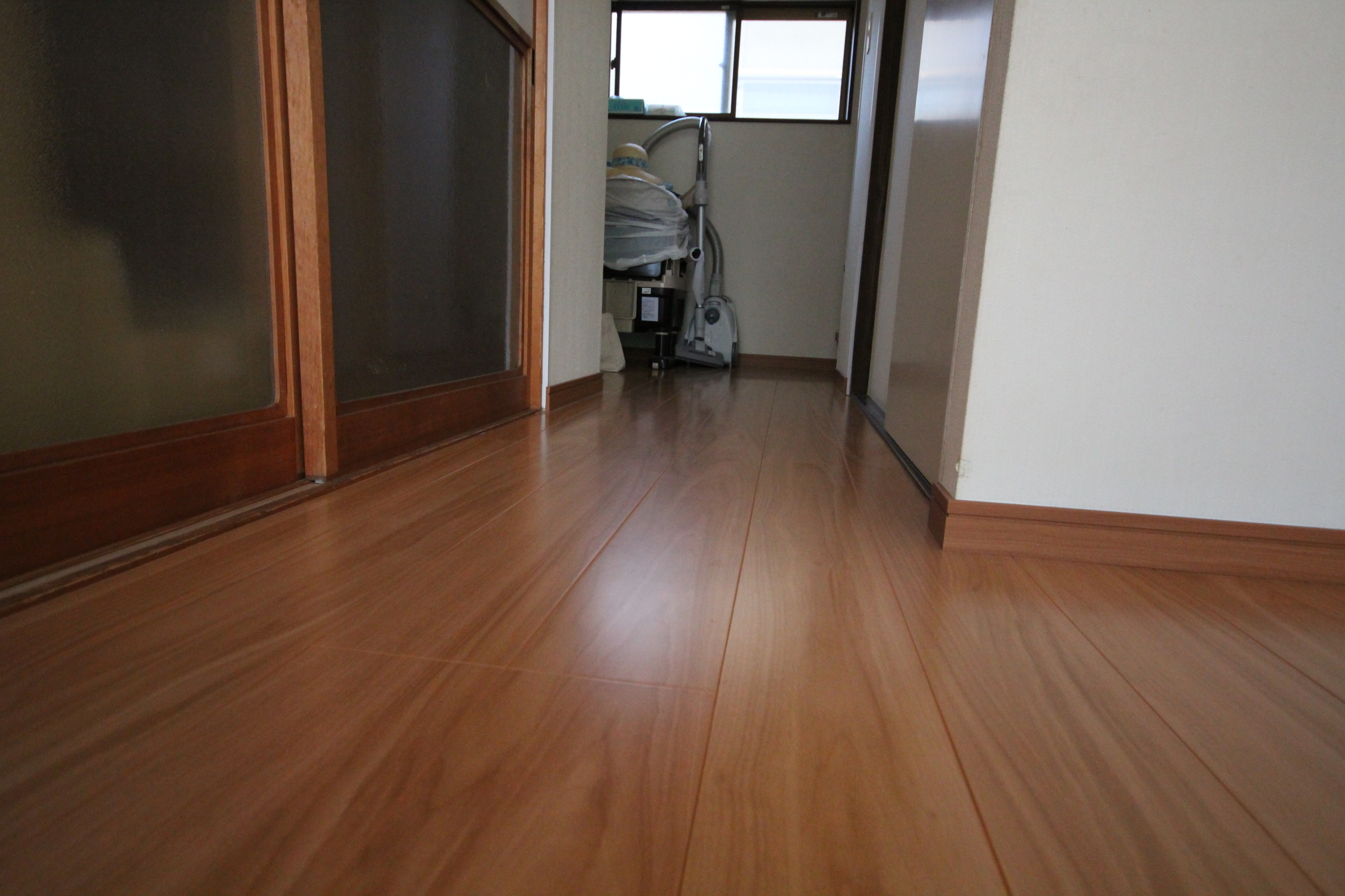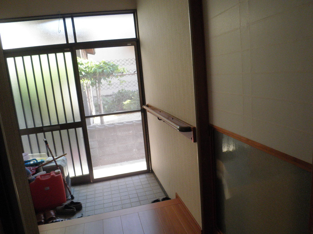 ご年配の御夫婦のお宅の、廊下の工事をさせていただきました。3㎝ほどの段差があった廊下には床板を張り段差をなくし、玄関と廊下には手すりを取り付けました。工事中は大変ご不便をおかけしましたが、作業終了後は、歩行器をご使用のご施主様に大変喜んでいただく事ができました。