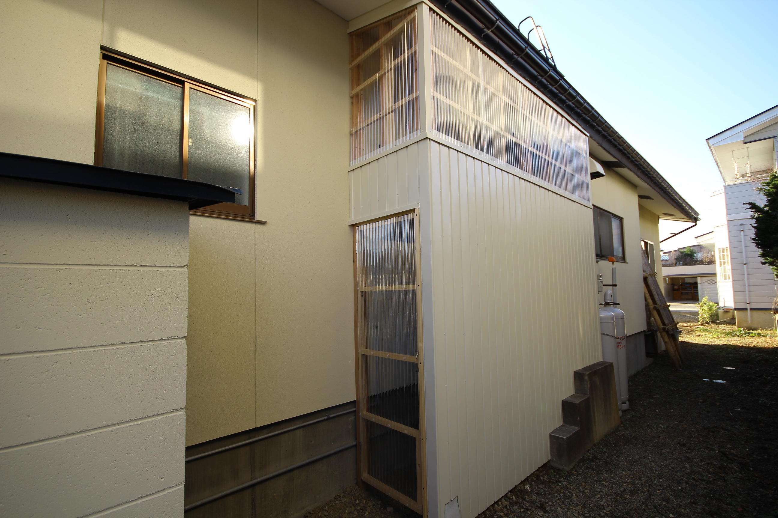 勝手口に風除室を取り付けたいとのご相談をいただいてから、どんな方法がいいのか、どうすれば安く丈夫なものができるかなどを検討しました。雪が積もっても光が差し込むように工夫し、今回の工事となりました。お忙しい中、何度も話し合いをさせていただきありがとうございました。