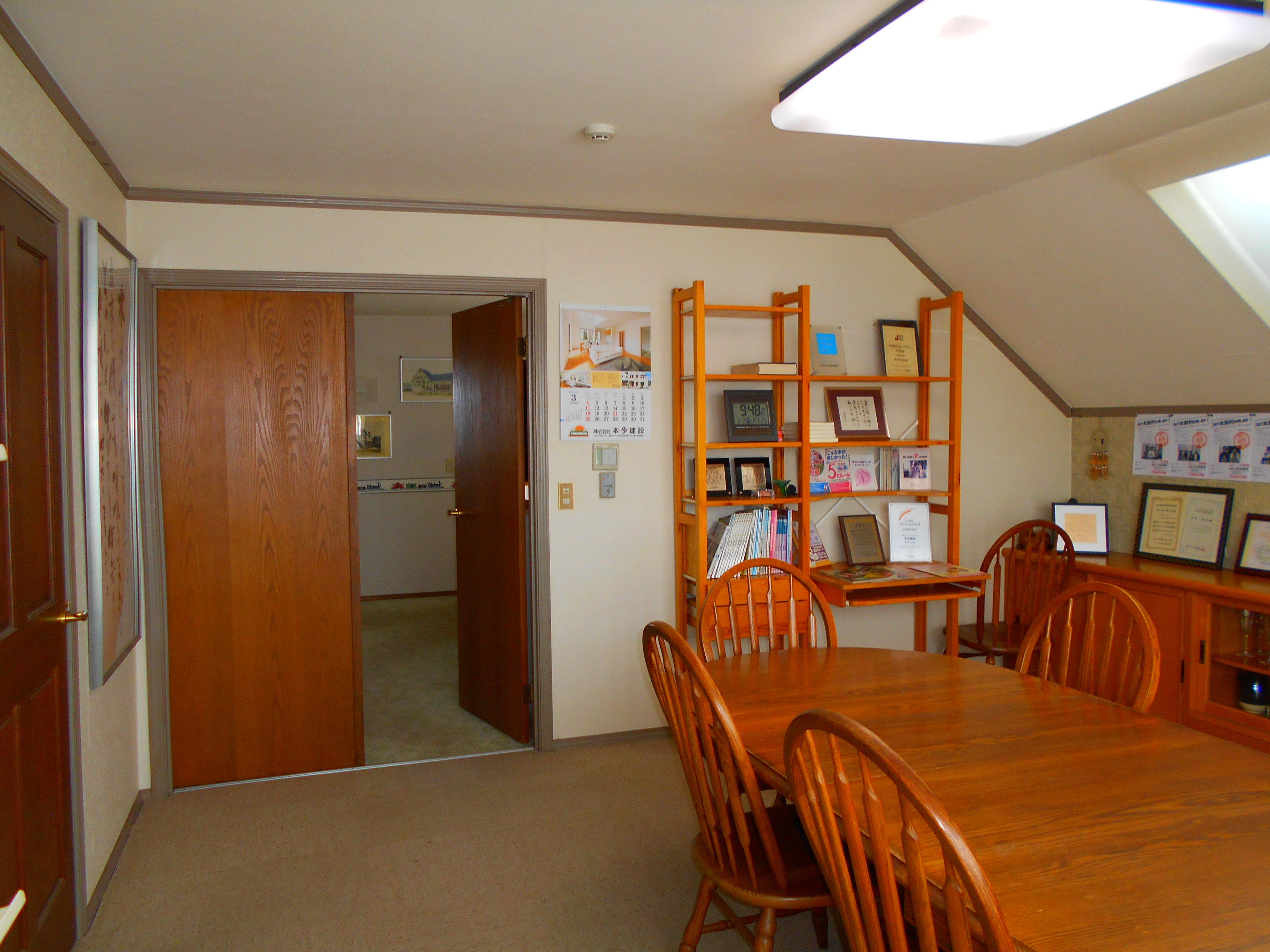 大切なお客様をお通しする、応接室のリフォーム工事を行いました。時が経ってくすんできたの壁紙と天井のクロスを張替え、フロアカーペットも新しいものに張替えました。
