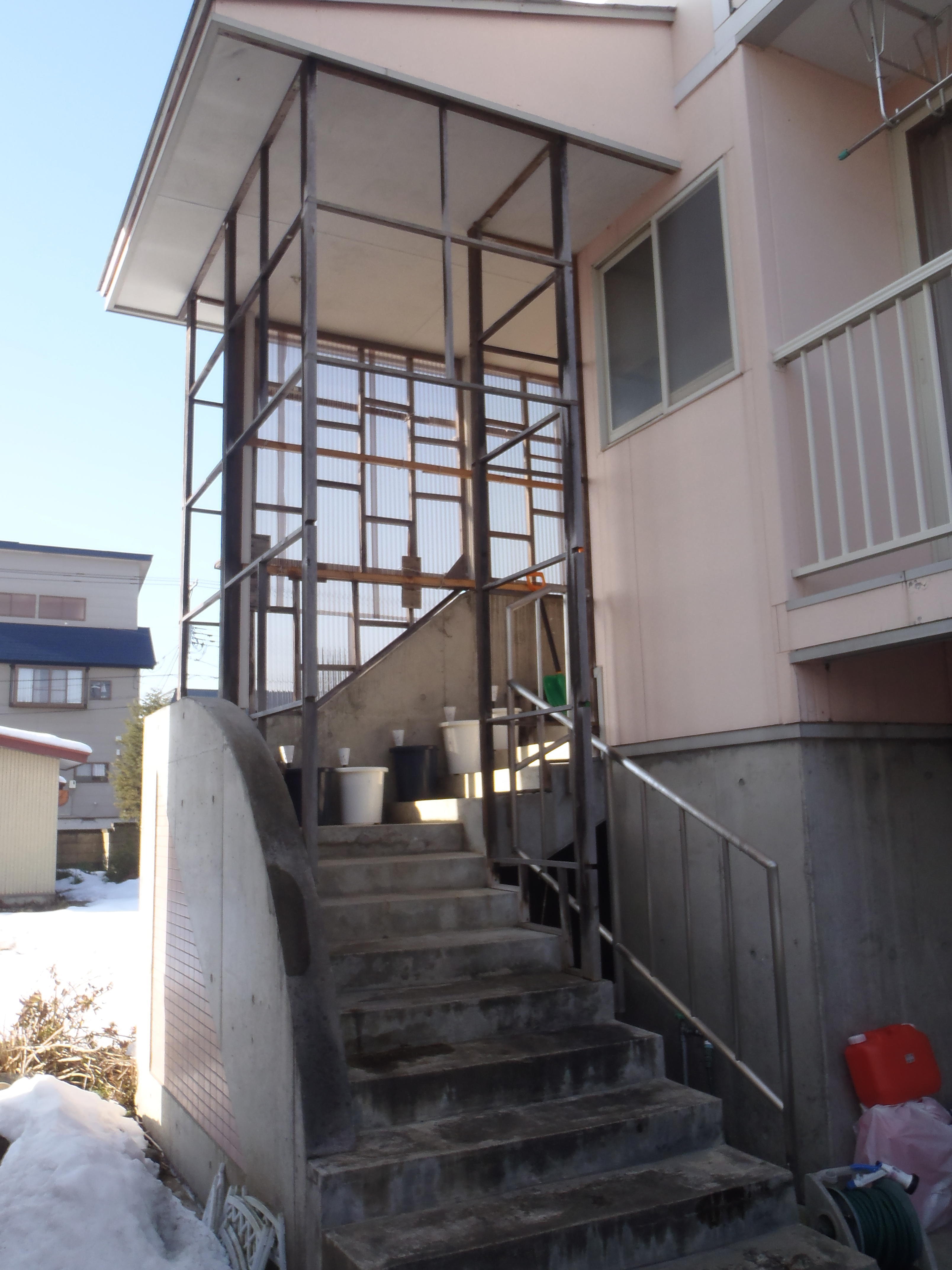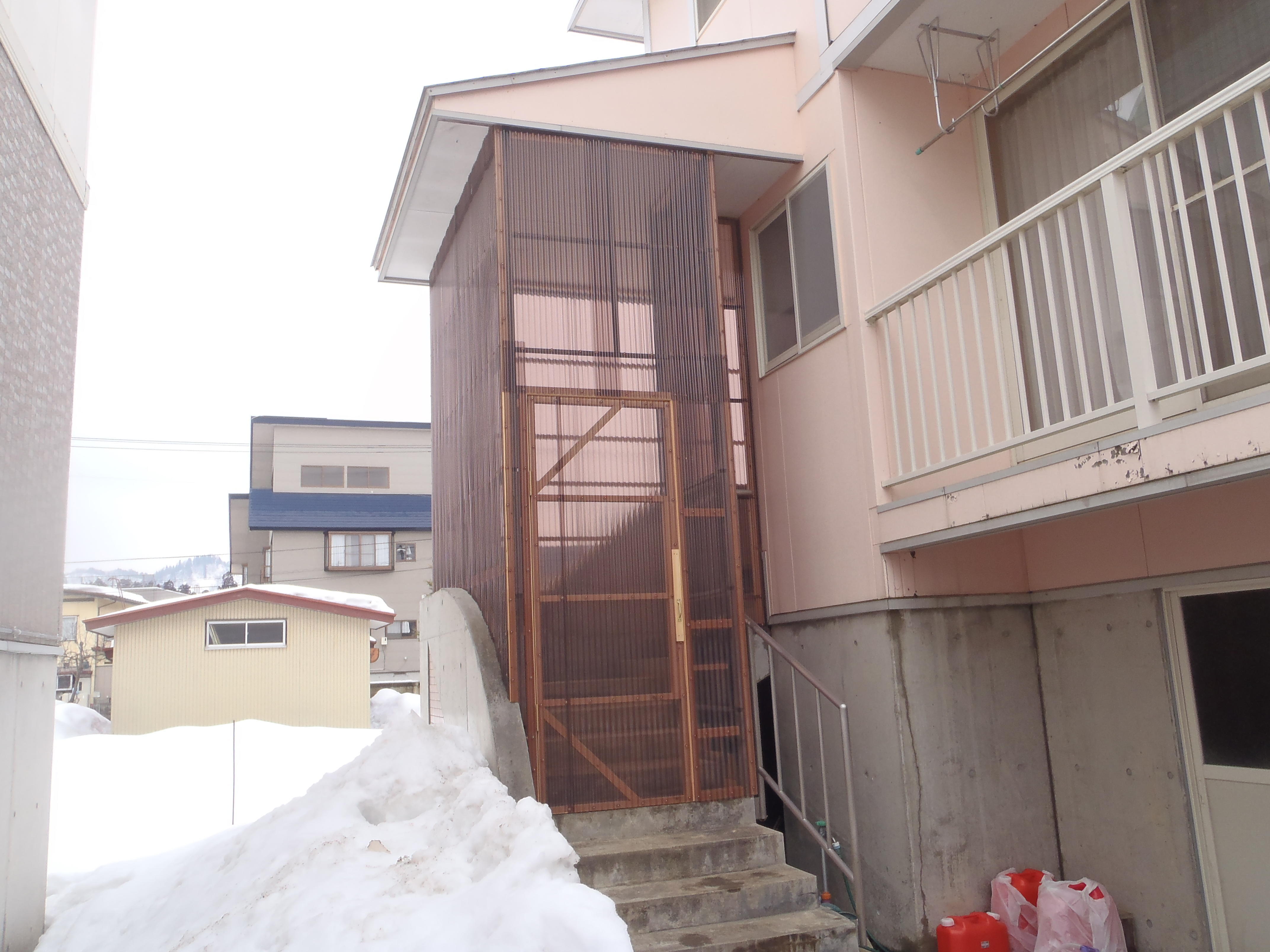 冬になると雪が降り積もって大変だった、二階の玄関までの外階段。 この度そちらに風除室を造作させていただきました。 既製品の風除室も検討しましたが、複雑な形状で工事自体も難しかった上、金額も高額になってしまうということで、大工さんで作らせていただきました。 金額は半分以下で収まり、日数も短期間で済みました。 雪が降り積もってからの工事となりご迷惑をお掛けしましたが、スムーズな工事にご協力いただき、誠にありがとうございました。