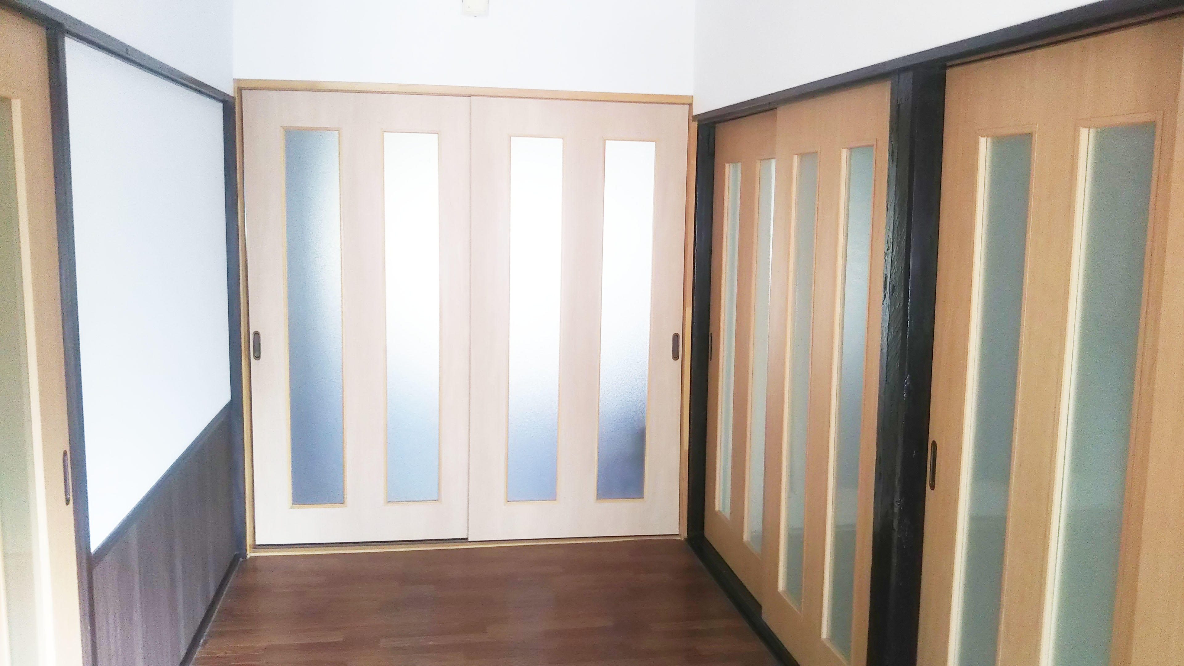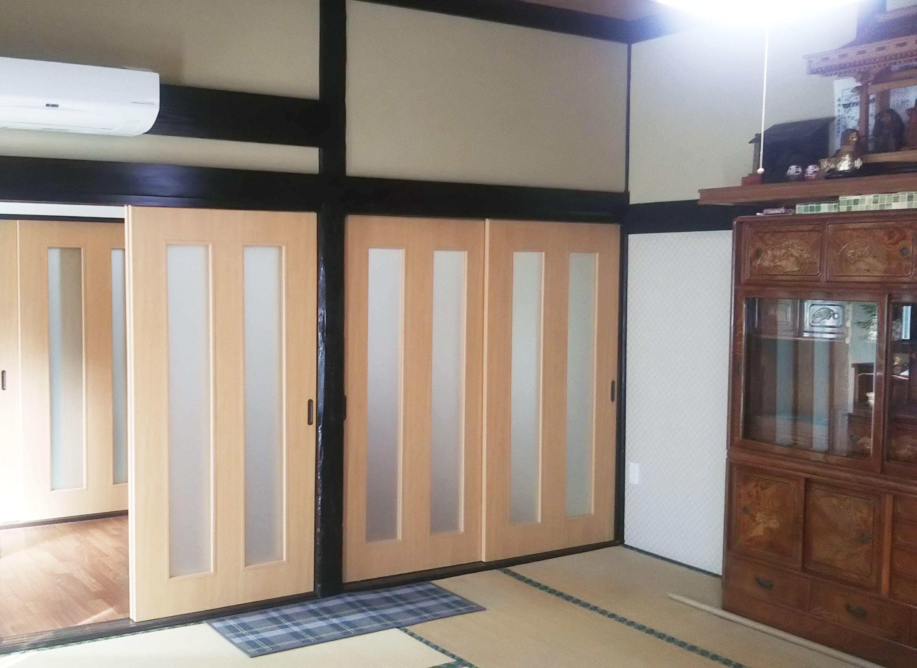 以前水まわりのリフォームをさせていただいたお客様からのご依頼で、内装工事を行いました。 壁は土壁の上にベニヤ板を貼り、その上からクロスを貼りました。和室のクロスは施工前と似たものを採用し、お部屋の雰囲気をそのまま残しました。また引き戸を交換し、障子は木部を黒く塗装。障子紙は破れにくいワーロン紙に張り替え、すりガラスも入れ替えたことで新品のようになりました。 お部屋のレイアウトは変えていませんが、各所を変更したことで室内全体が明るくなりました。住みながらの工事でしたが、お施主様にご協力いただきスムーズに進めることができました。工事をご依頼いただきありがとうございました。