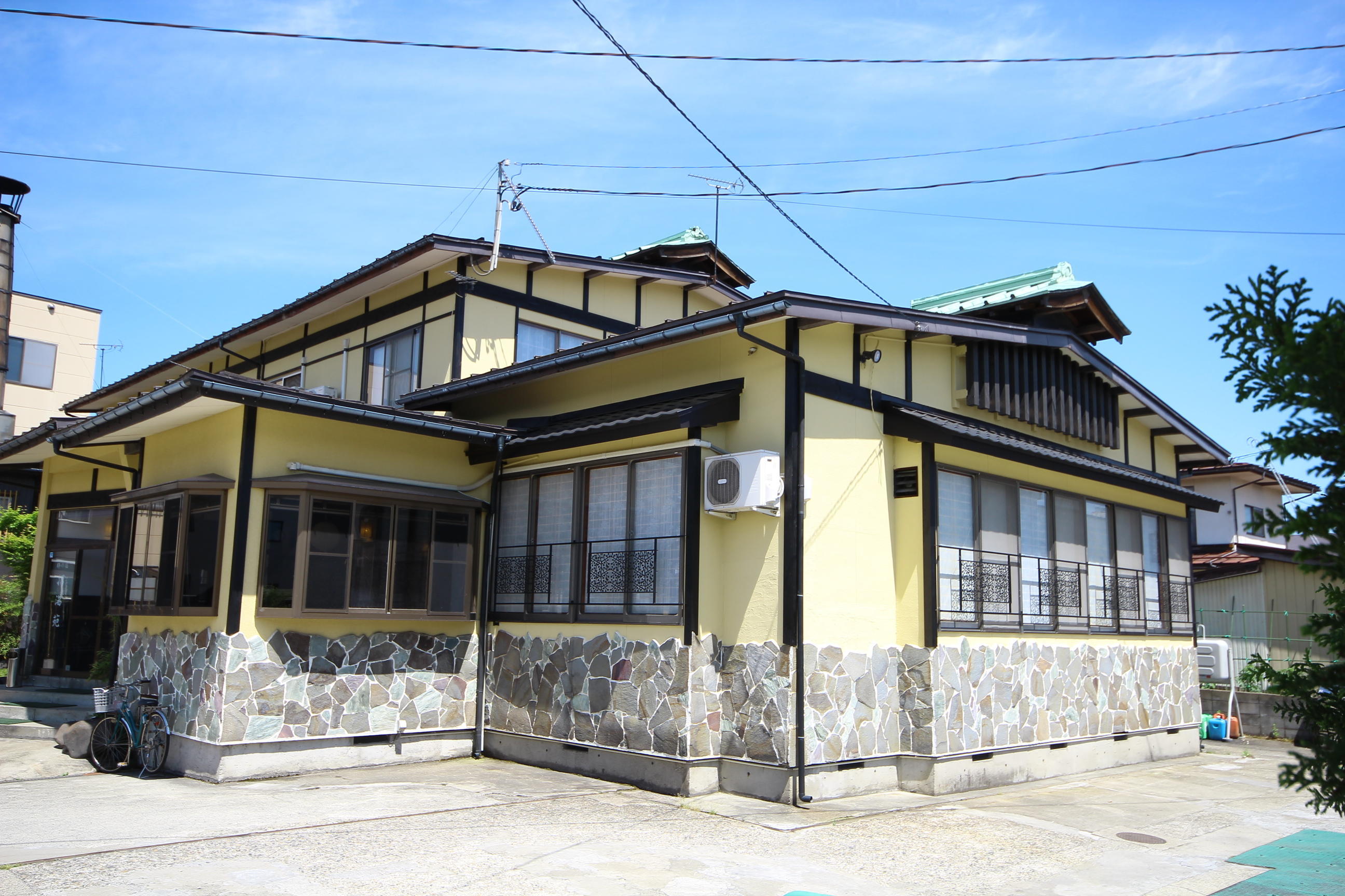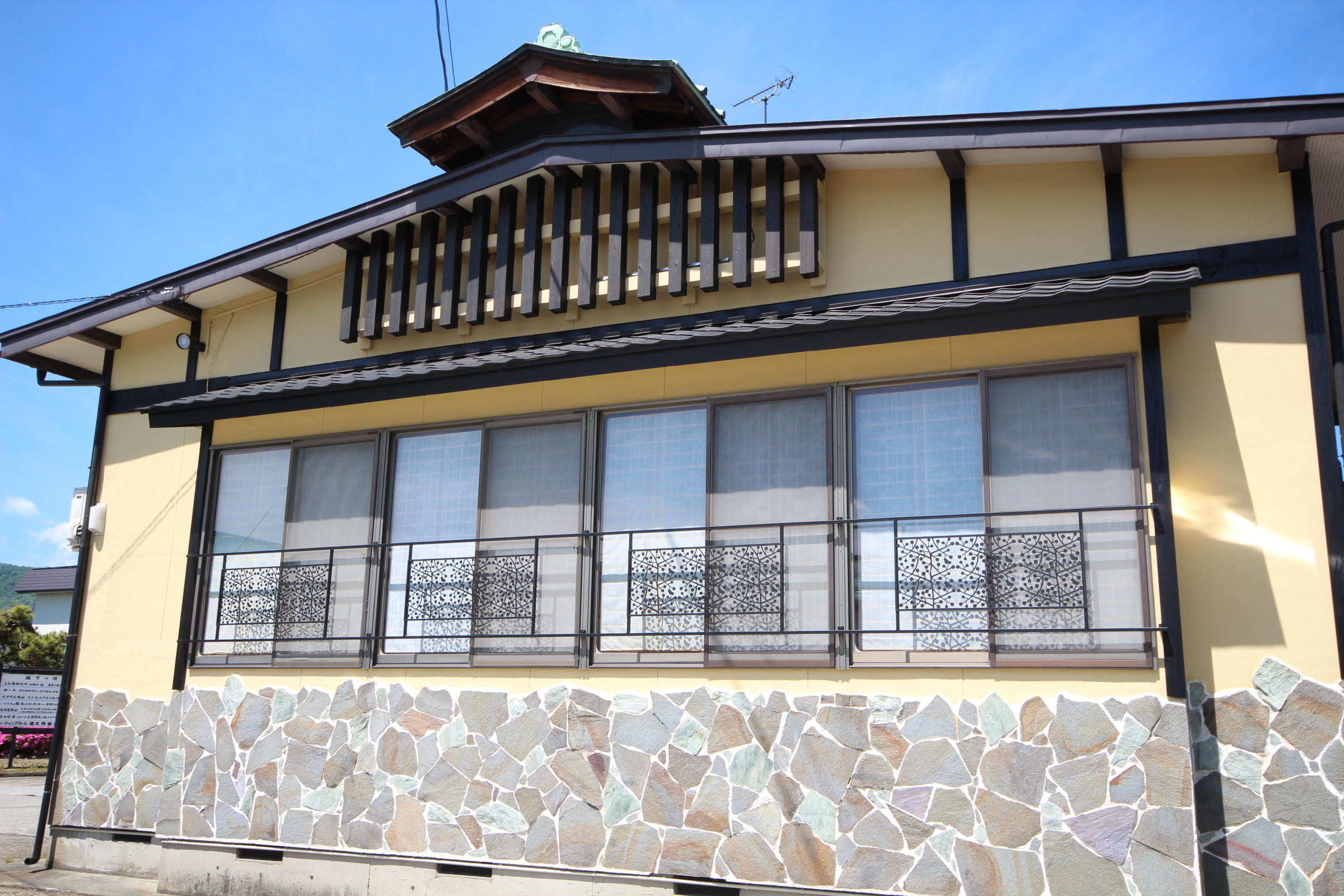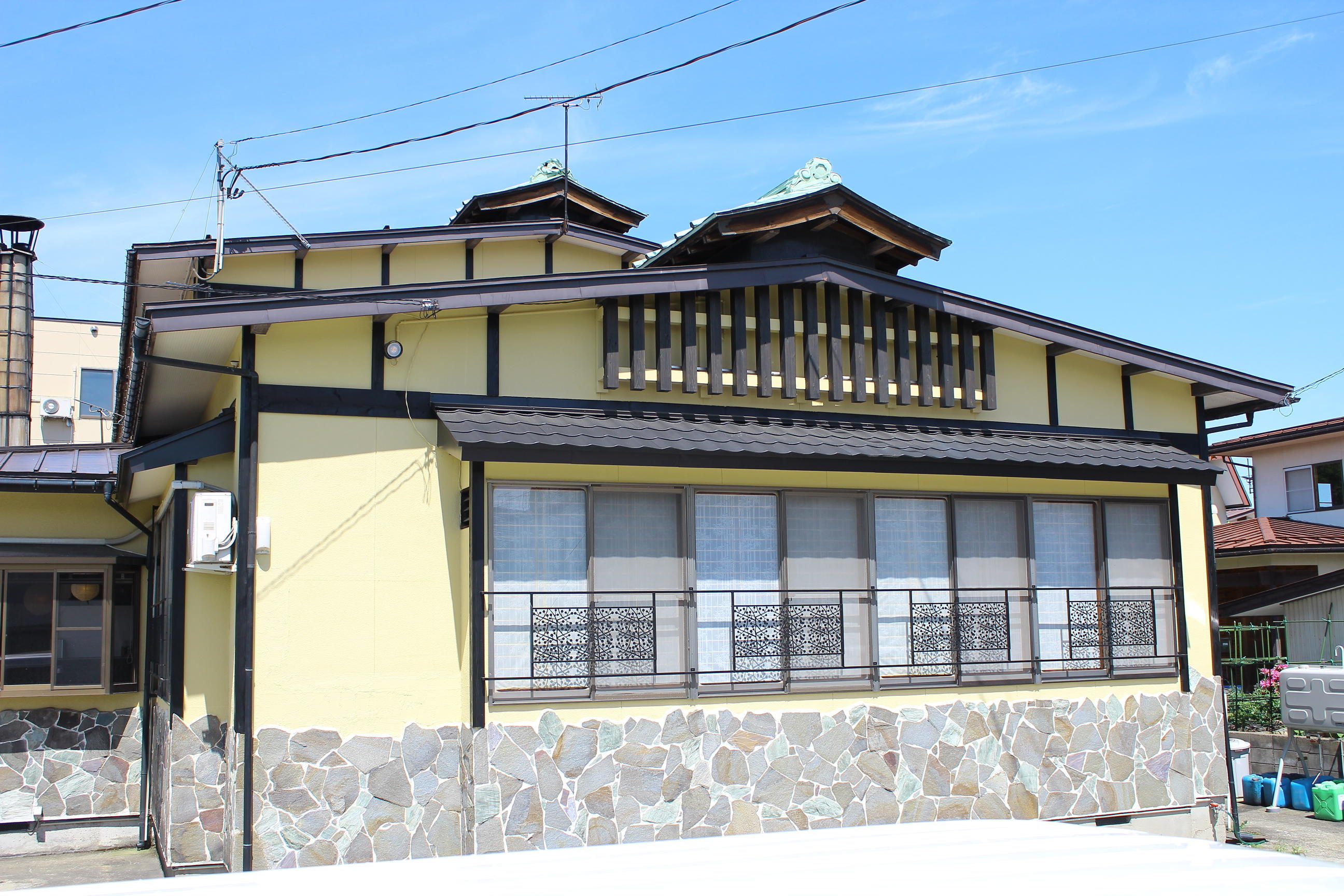 長年の汚れや劣化でくすんで見えていた外壁が、明るくキレイに蘇りました。優しいイエローの色合いが旅館の雰囲気とマッチし、木枠部分を黒にしたことでコントラストの映える素敵な仕上がりになりました。お施主様のご希望通りの出来栄えとなり、お喜びいただけてとても嬉しく思います。この度は工事をお任せいただきありがとうございました。これからもよろしくお願いいたします。